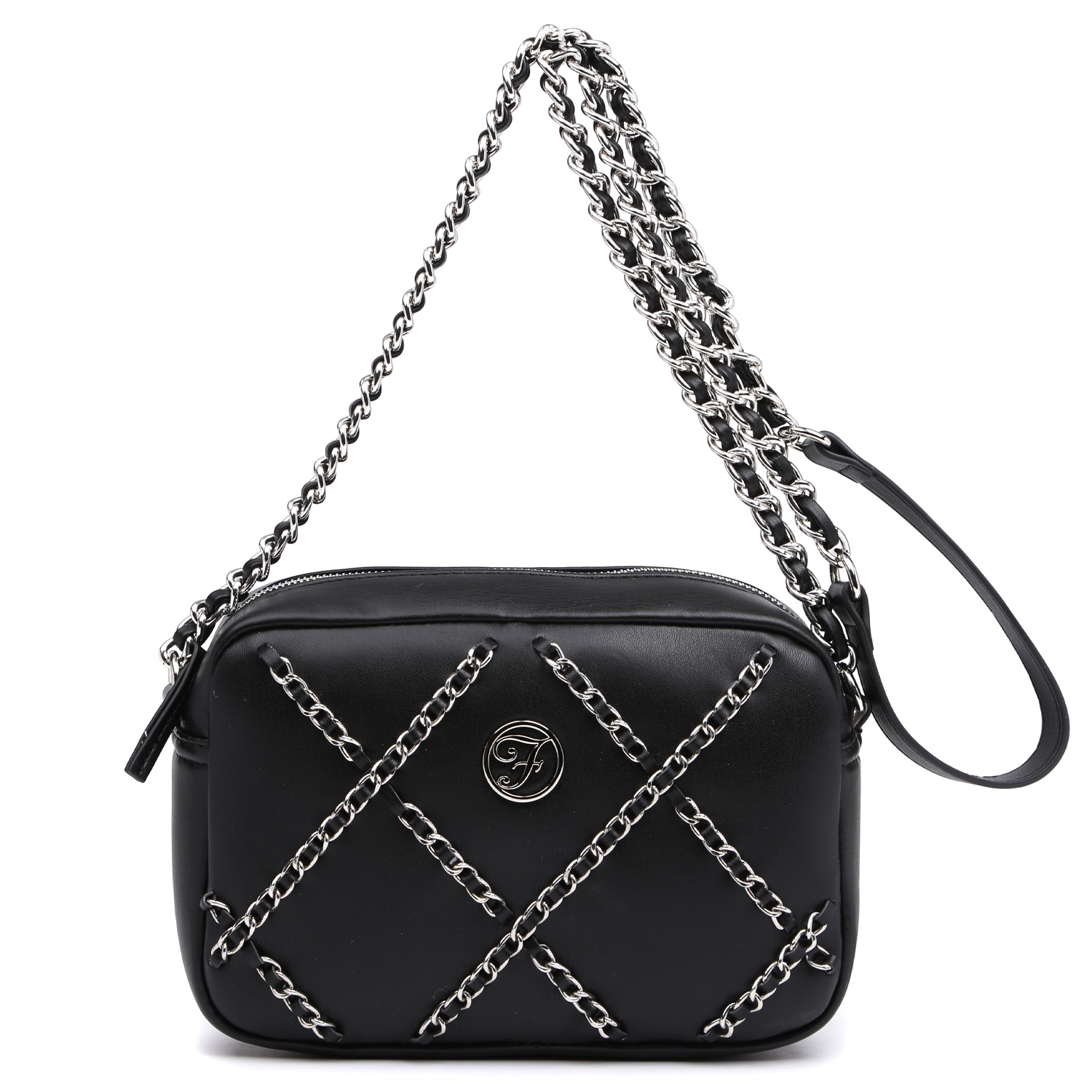 Вместительная кросс-боди FABRETTI в черном цвете выполнена из экокожи приятной мягкой фактуры. Основное отделение закрывается на молнию с удобным поводком. Внутри 2 кармана: открытый и на молнии. Лицевая сторона декорирована изящными цепочками, которые составляют геометрический орнамент. Такой же орнамент только в стеганой отделке повторяется на тыльной стороне аксессуара. Плечевой ремень-цепочка гармонично дополняет дизайн изделия. Цвет фурнитуры - серебро.