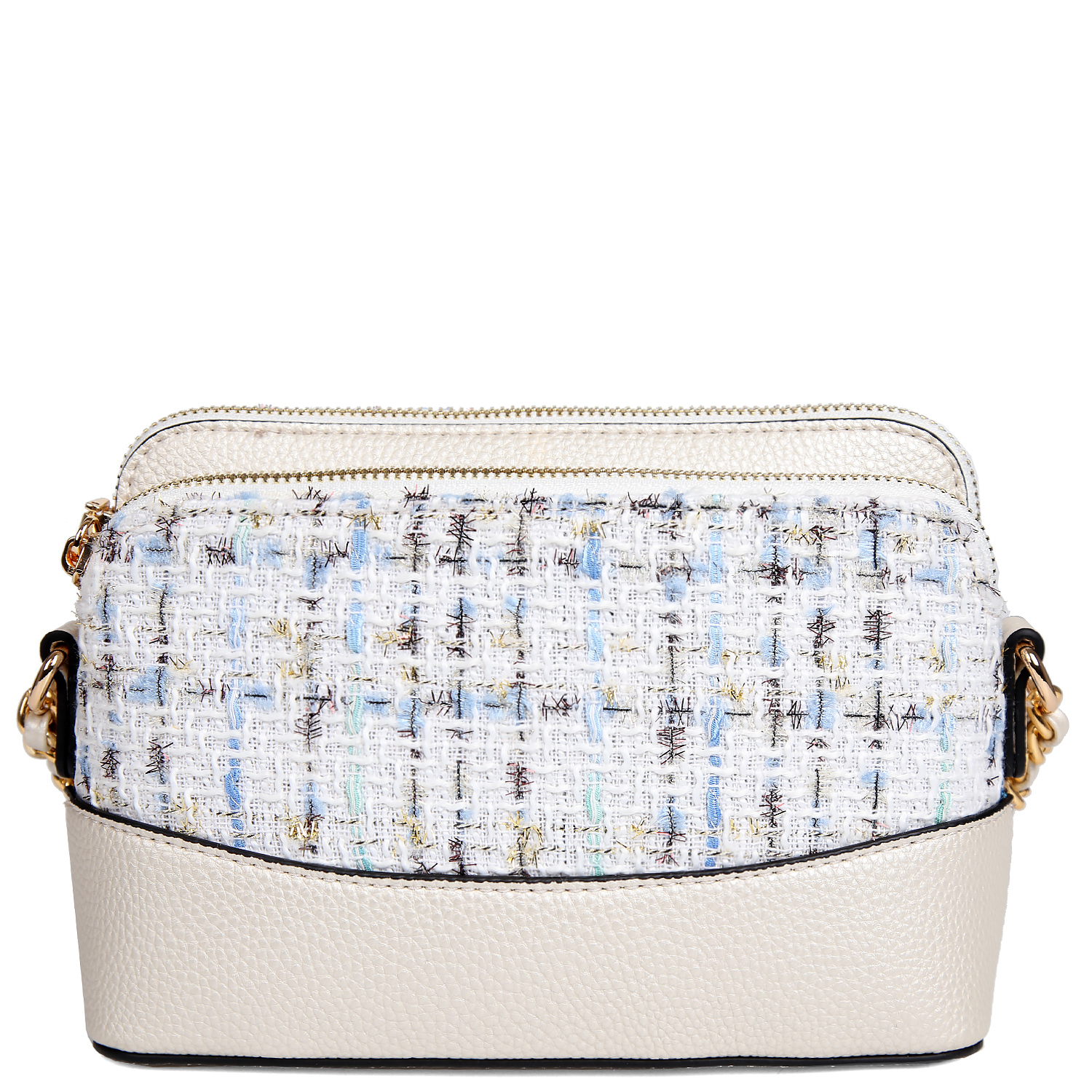 Компактная кросс-боди FABRETTI выполнена из экокожи в жемчужном оттенке и декорирована твидовыми вставками. Модель отличается продуманной системой хранения, имеет 3 отделения. Основное отделение самое вместительное, закрывается на полукруглую молнию. Внутри расположен боковой карман для мелочей на молнии. Среднее отделение закрывается на магнитную кнопку. И третье – также на молнии, внутри есть открытый боковой карман. Плечевой ремень несъемный, длина не регулируется. Фурнитура под золото гармонично дополняет дизайн изделия.