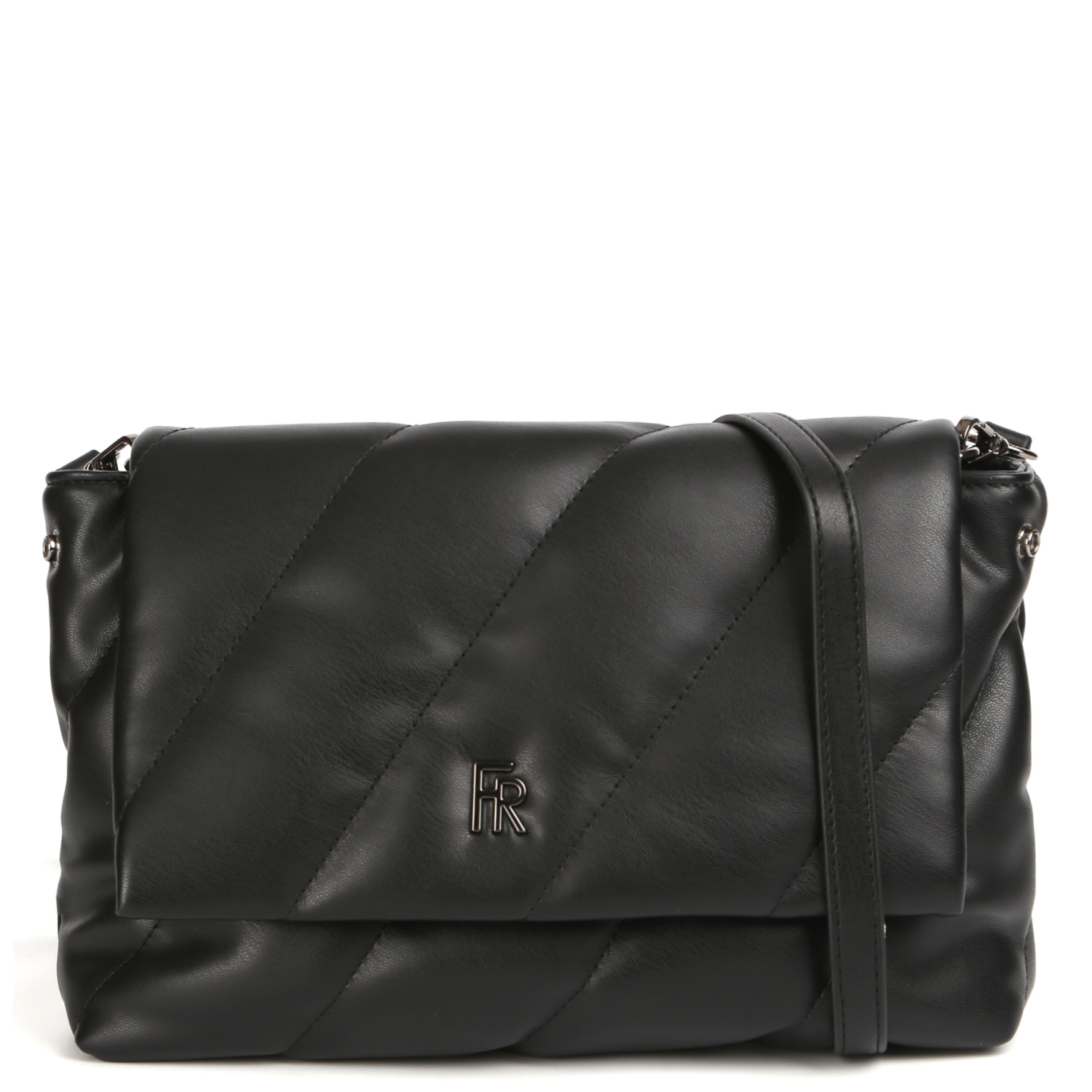 Кросс-боди FABRETTI в черном цвете выполнена из экокожи гладкой фактуры и декорирована диагональной стёжкой. Сумка закрывается клапаном на двух магнитных кнопках. Внутри 2 боковых кармана для мелочей: открытый и на молнии. Плечевой ремень съемный, ширина - 1,5 см. При необходимости его можно снять, и кросс-боди станет стильным клатчем. Цвет фурнитуры - черненый никель.