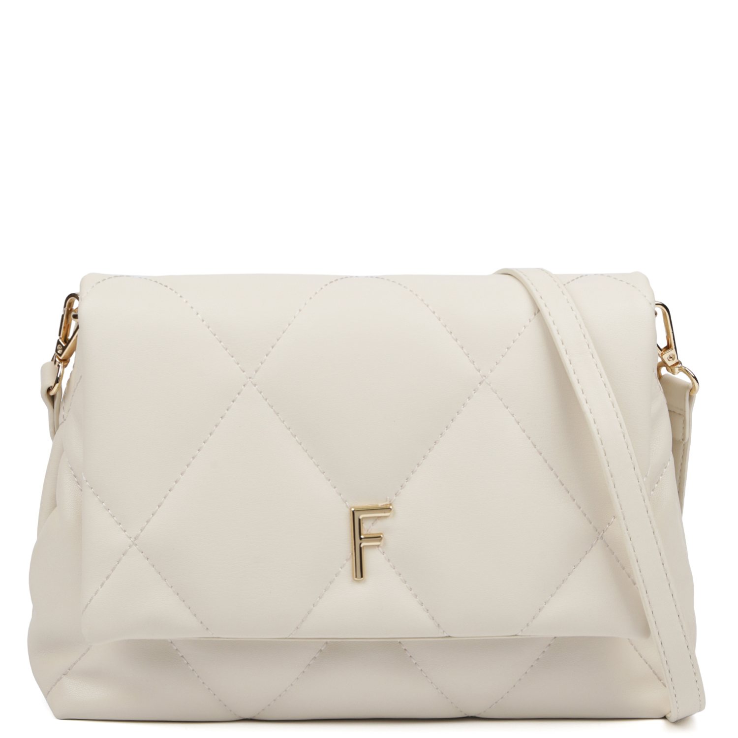 Стильная кросс-боди мягкой формы FABRETTI выполнена из стеганой экокожи в светло-бежевом оттенке. Основное отделение закрывается клапаном на 2 магнитных кнопках. Внутри 2 боковых кармана для мелочей: открытый и на молнии. По бокам предусмотрена возможность регулировки объема с помощью кнопок. Съемный плечевой ремень регулируется по длине, ширина - 1,5 см. При необходимости его можно снять и носить сумку как клатч. Цвет фурнитуры - золото.