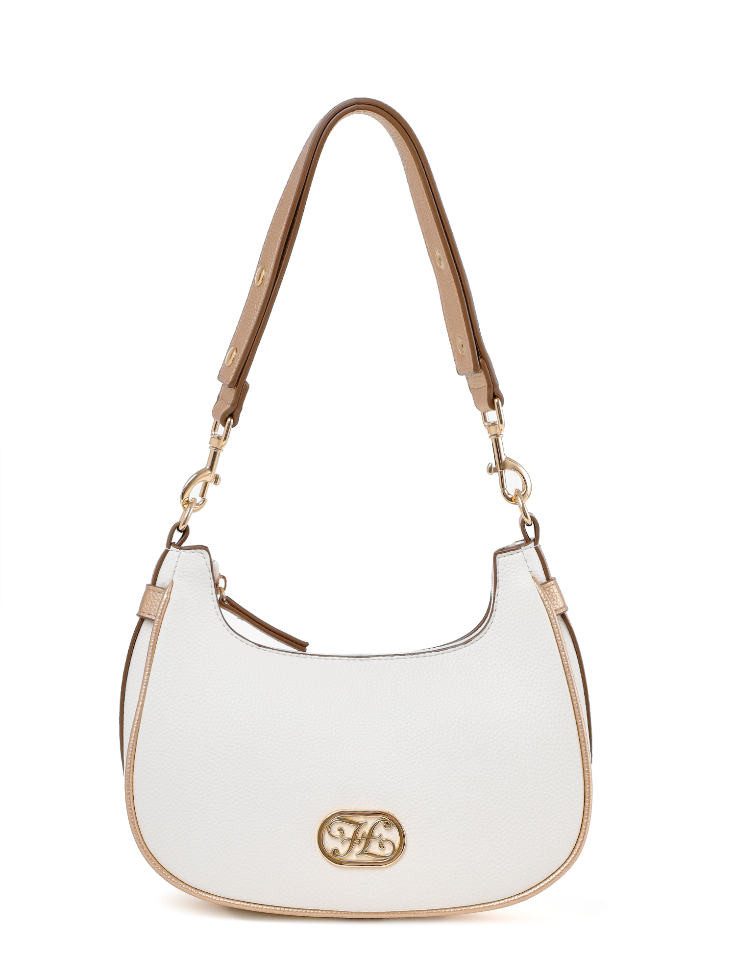 Небольшая женская сумка итальянского бренда FABRETTI из плотной зернистой экокожи белого цвета с лаконичной отделкой из экокожи мягко блестящего бронзового оттенка.