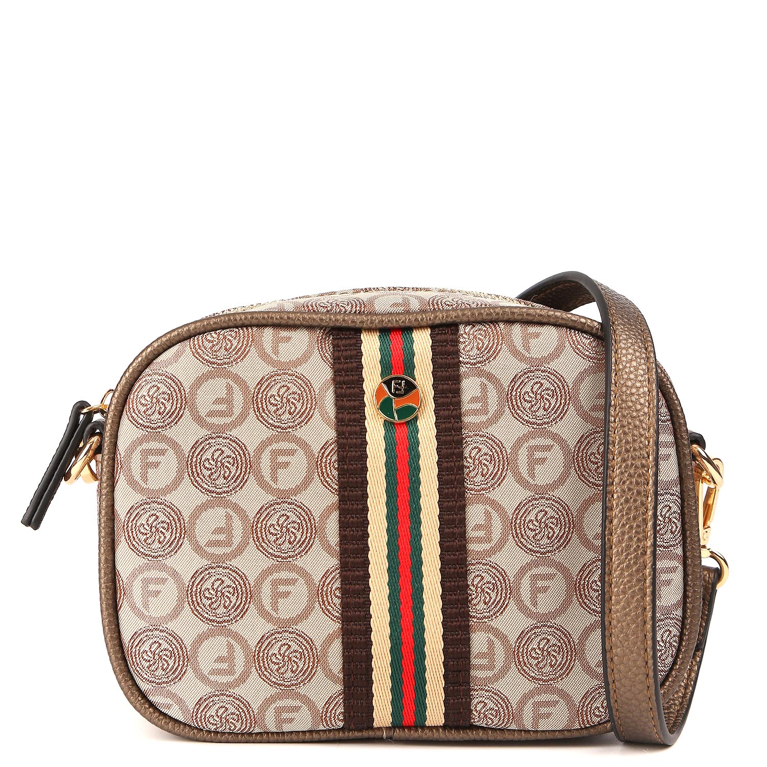 Компактная кросс-боди FABRETTI в бежевом оттенке декорирована узором в стиле "Логомания". Материал сумки состоит из двух слоев: нижний слой из экокожи, верхний - из жаккарда. Двухслойный материал - это текстильное волокно, дублированное с высококачественным полиуретаном посредством термической обработки. Основное отделение закрывается на полукруглую молнию. Внутри 2 боковых кармана для мелочей: открытый и на молнии. Лицевая сторона украшена контрастной текстильной лентой. На тыльной стороне расположен карман быстрого доступа на молнии. Съемный плечевой ремень регулируется по длине, ширина - 1,5 см. Цвет фурнитуры - золото.
