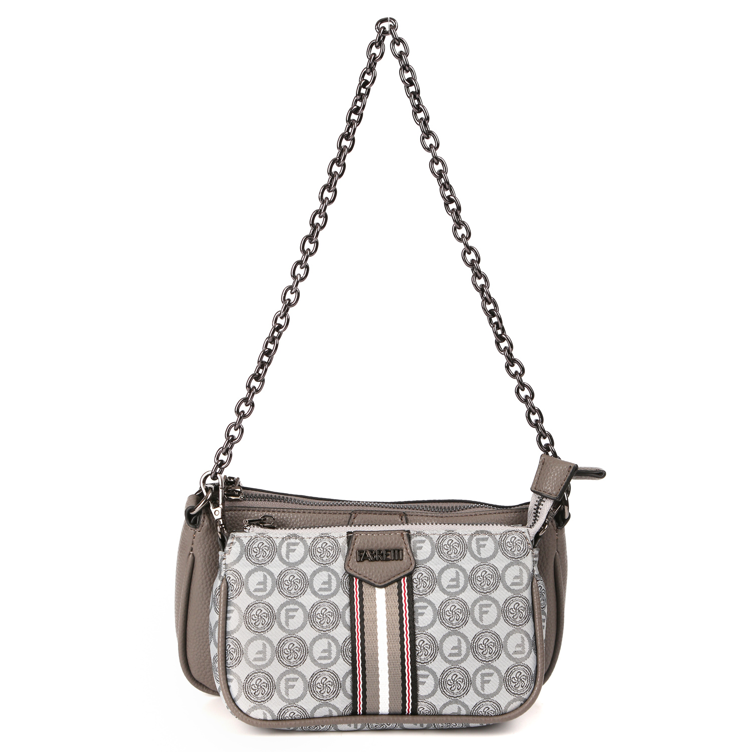 Функциональная кросс-боди FABRETTI в сером оттенке сочетает в себе 3 аксессуара, которые можно комбинировать между собой. Каждый элемент присоединяется с помощью карабинов. Основная сумка выполнена из экокожи закрывается на молнию с металлическим поводком. Внутри предусмотрены 2 боковых кармана для мелочей: на молнии и открытый. Размер: 25*14*5 см. Дополнительная сумочка выполнена из двухслойного материала - это текстильное волокно, дублированное с высококачественным полиуретаном посредством термической обработки. Закрывается на молнию и может быть использована отдельно в качестве миниатюрного клатча. Размер: 20*12*4 см. В комплекте идет съемная металлическая цепочка, которую можно использовать как декор или как ручку. А также съемный текстильный ремень (ширина - 4 см), длина которого регулируется. К нему крепится круглая монетница, размер 9*9*2 см. Цвет фурнитуры - черненый никель.