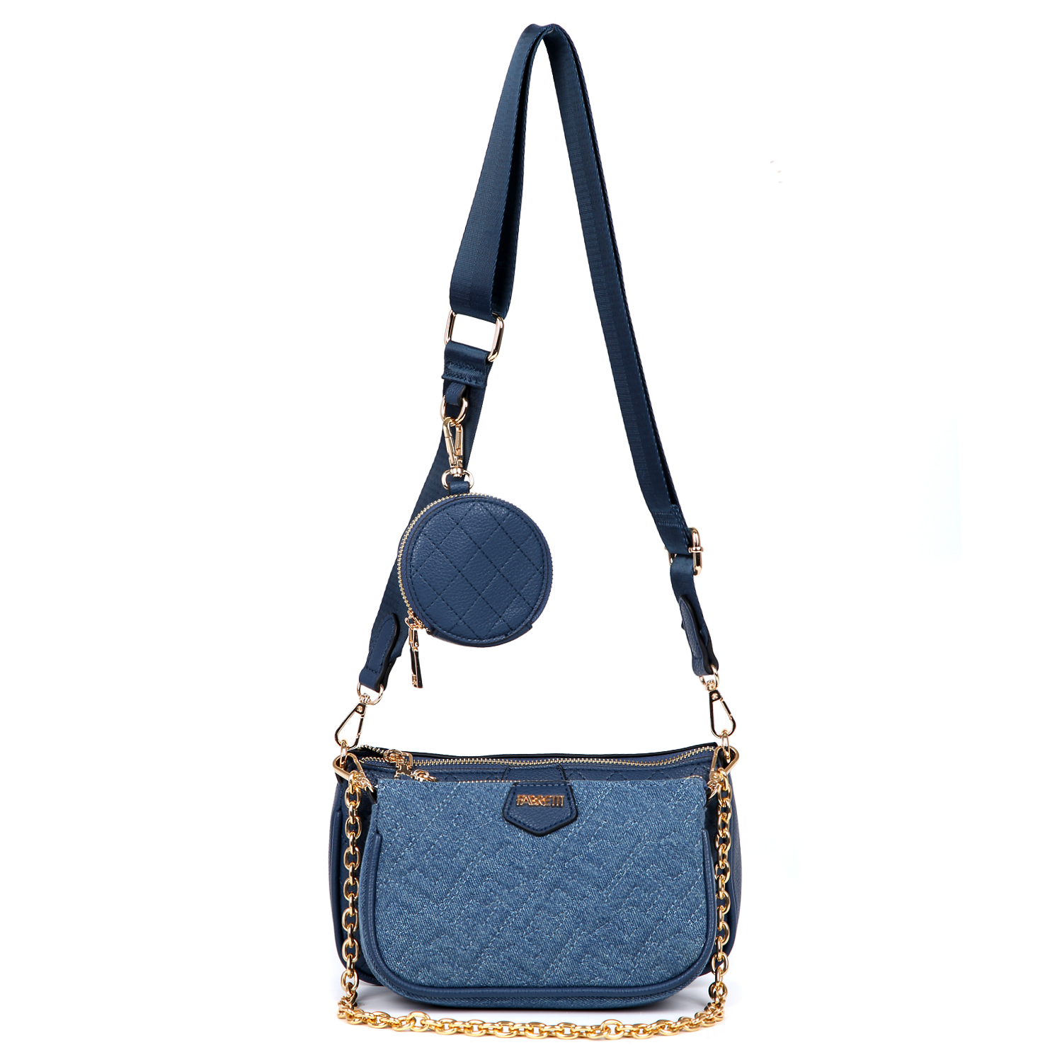 Функциональная кросс-боди FABRETTI из экокожи синего цвета сочетает в себе 3 аксессуара, которые можно комбинировать между собой. Каждый элемент присоединяется с помощью карабинов. Основная сумка закрывается на молнию с удобным поводком. Внутри предусмотрены 2 боковых кармана для мелочей: на молнии и открытый. Лицевая сторона декорирована ромбовидной стежкой. Дополнительная сумочка - из натурального стеганого денима, закрывается на молнию и может быть использована отдельно в качестве миниатюрного клатча. В комплекте идет несъемная металлическая цепочка, которую можно использовать как декор или как ручку. А также съемный широкий текстильный ремень, длина которого регулируется. К нему крепится круглая монетница. Фурнитура под золото гармонично дополняет общий дизайн изделия.