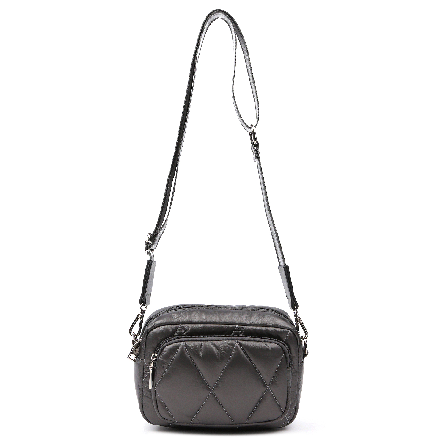 Дутая кросс-боди FABRETTI компактна и вместительна одновременно. Модель выполнена из экокожи темно-серого цвета и декорирована ромбовидной стёжкой. Современный высокотехнологичный материал на полиуретановой основе обладает водоотталкивающими свойствами, устойчив к температурным перепадам до -25 C, приятен на ощупь. Основное отделение закрывается на молнию с удобным поводком. Внутри 2 боковых кармана для мелочей: открытый и на молнии. На лицевой стороне предусмотрен накладной карман быстрого доступа на молнии. Текстильный плечевой ремень съемный, легко регулируется по длине.