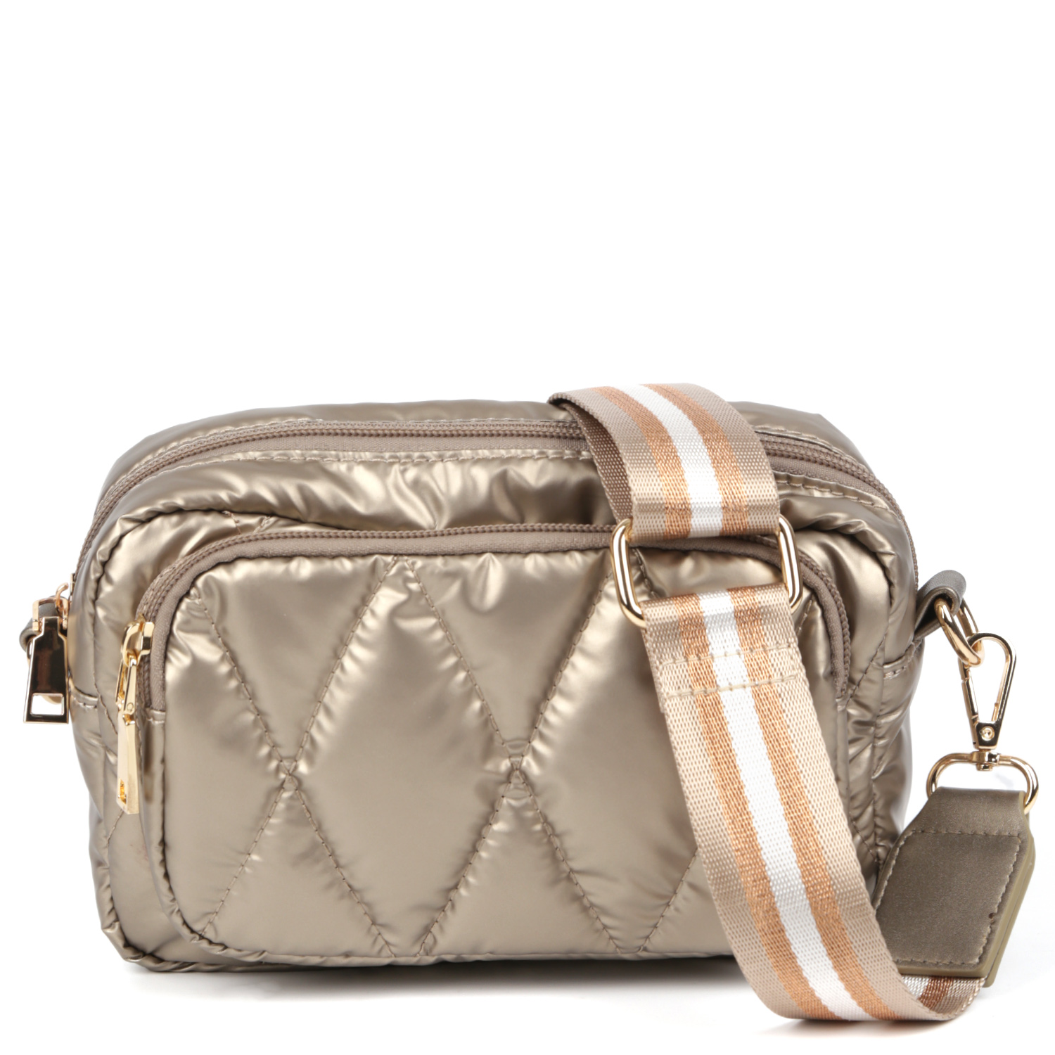 Дутая кросс-боди FABRETTI компактна и вместительна одновременно. Модель в золотисто-бежевом оттенке выполнена из высокотехнологичного полиэстера, который устойчив к воздействию влаги и перепаду температур. В качестве декора выбрана ромбовидная стёжка. Основное отделение закрывается на молнию с металлическим поводком. Внутри 2 боковых кармана для мелочей: открытый и на молнии. На лицевой стороне предусмотрен накладной карман быстрого доступа на молнии. Текстильный плечевой ремень съемный, регулируется по длине, ширина - 4 см. Цвет фурнитуры - золото.