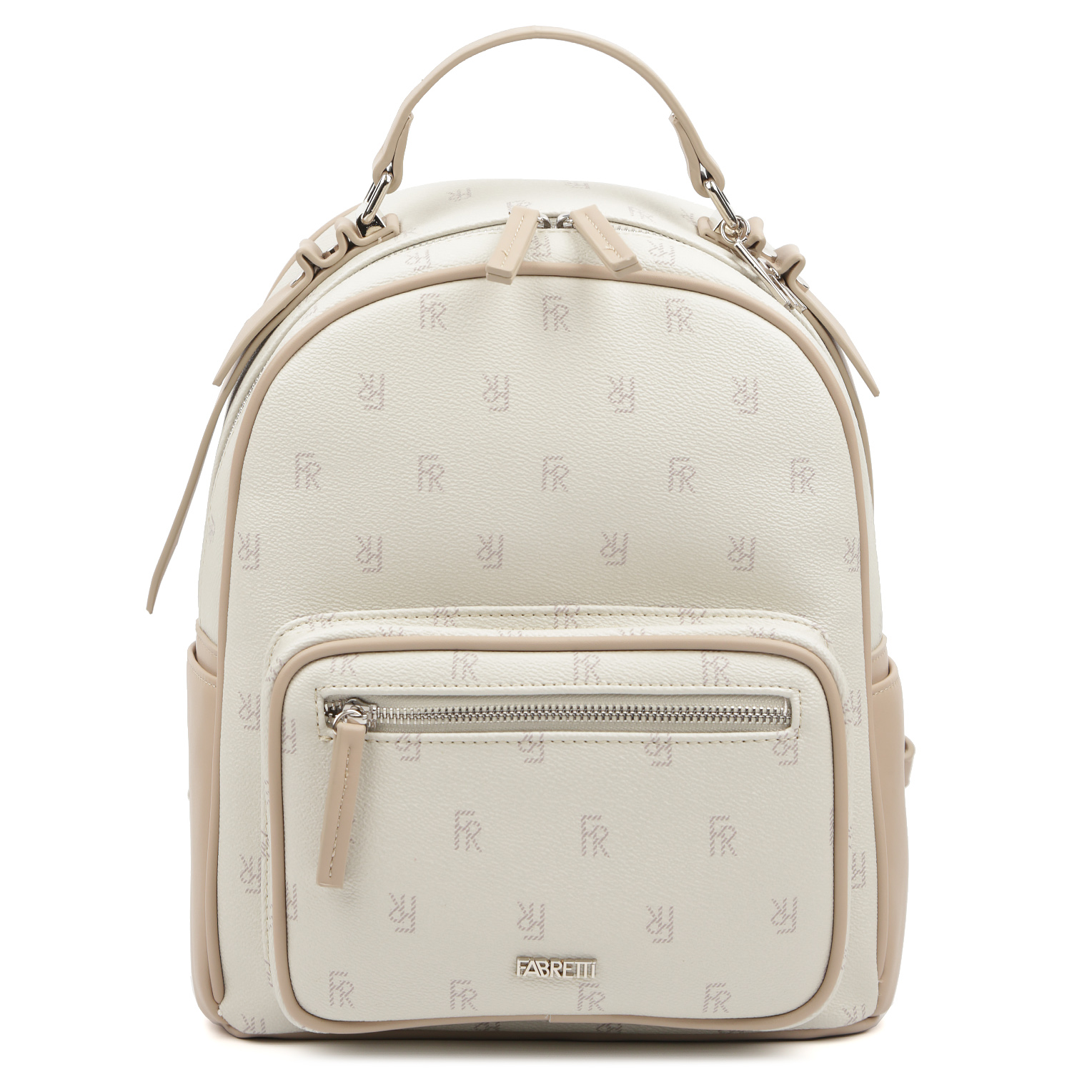 Рюкзак FABRETTI в белом цвете с малиновыми вставками выполнен из экокожи и декорирован принтом с изображением монограмм бренда. Основное отделение закрывается на молнию с 2 удобными поводками. Внутри 3 боковых кармана: 2 открытых и 1 на молнии. На тыльной стороне предусмотрен вертикальный карман на молнии. На лицевой стороне расположен вместительный накладной карман на молнии. По бокам предусмотрены открытые карманы быстрого доступа. Лямки регулируются по длине, ширина - 2 см. Сверху есть удобная ручка, которая позволяет носить аксессуар в руке. Цвет фурнитуры - серебро.