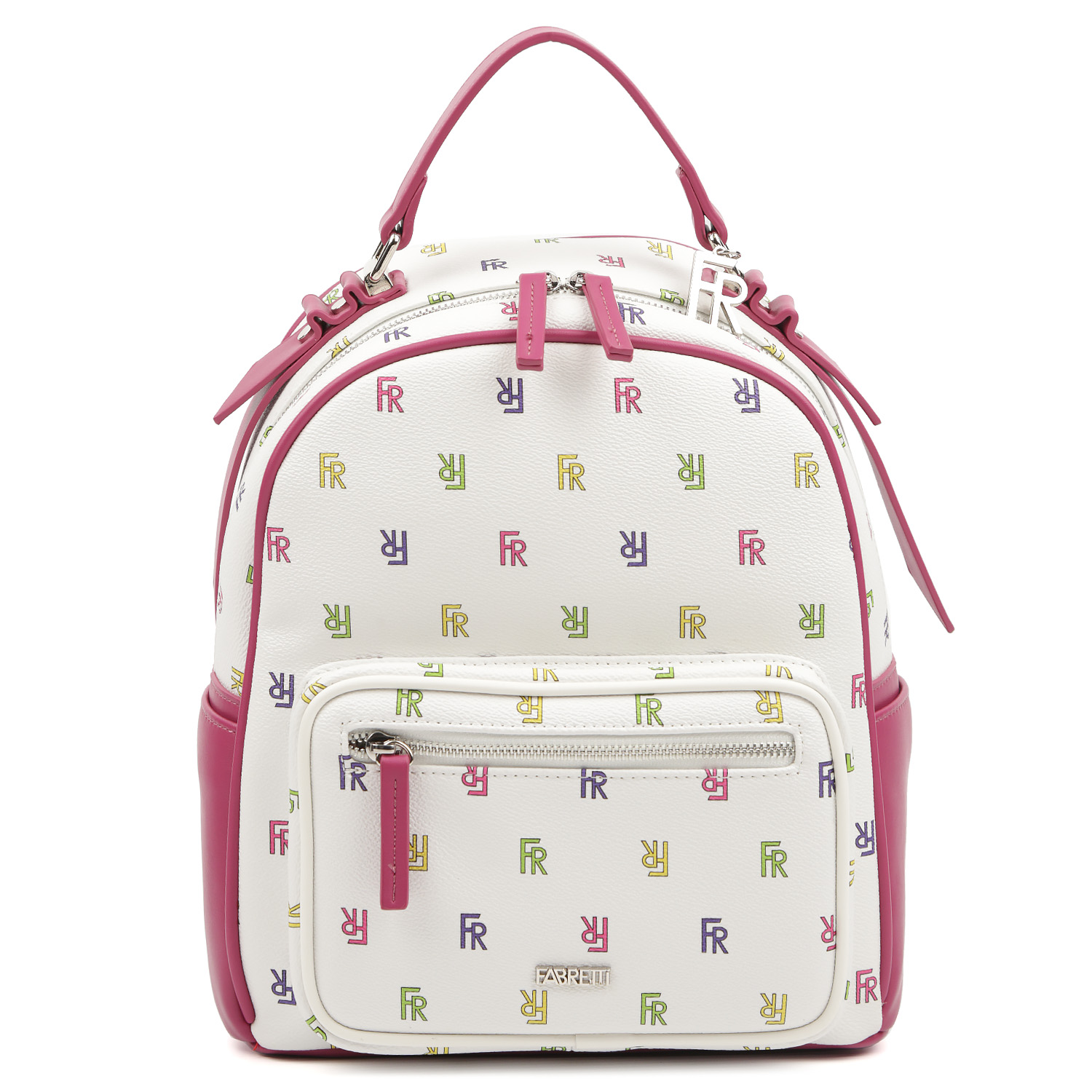 Рюкзак FABRETTI в белом цвете с малиновыми вставками выполнен из экокожи и декорирован принтом с изображением монограмм бренда. Основное отделение закрывается на молнию с 2 удобными поводками. Внутри 3 боковых кармана: 2 открытых и 1 на молнии. На тыльной стороне предусмотрен вертикальный карман на молнии. На лицевой стороне расположен вместительный накладной карман на молнии. По бокам предусмотрены открытые карманы быстрого доступа. Лямки регулируются по длине, ширина - 2 см. Сверху есть удобная ручка, которая позволяет носить аксессуар в руке. Цвет фурнитуры - серебро.
