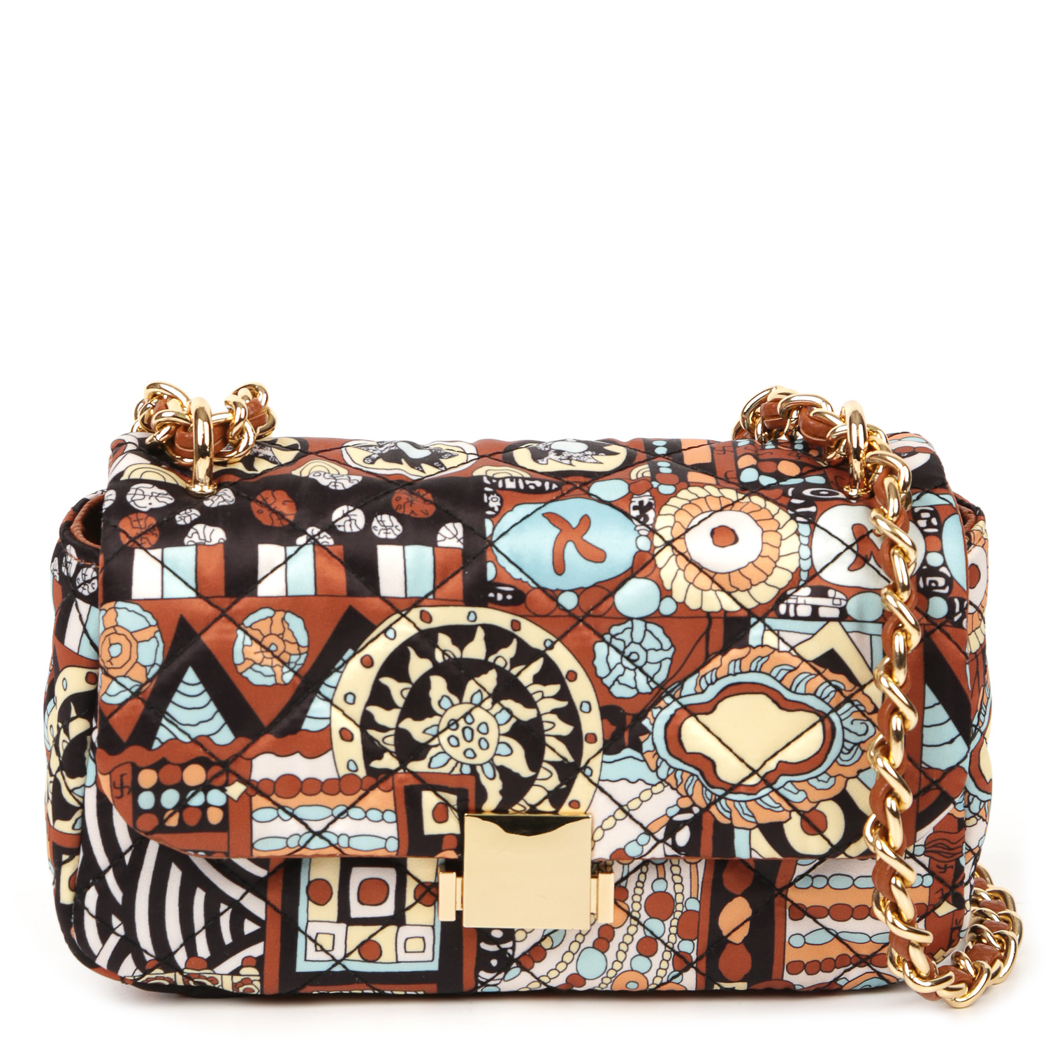 Оригинальная кросс-боди FABRETTI станет заметной деталью в образе. Модель выполнена из экокожи в коричневом оттенке и декорирована стегаными текстильными вставками с абстрактным узором в этностиле. Сумка закрывается клапаном с механическим замком. Внутри есть боковой карман на молнии. Функцию плечевого ремня выполняет цепочка, которую можно носить двумя способами: через плечо или на плече, трансформировав в 2 ручки. Цвет фурнитуры - золото.