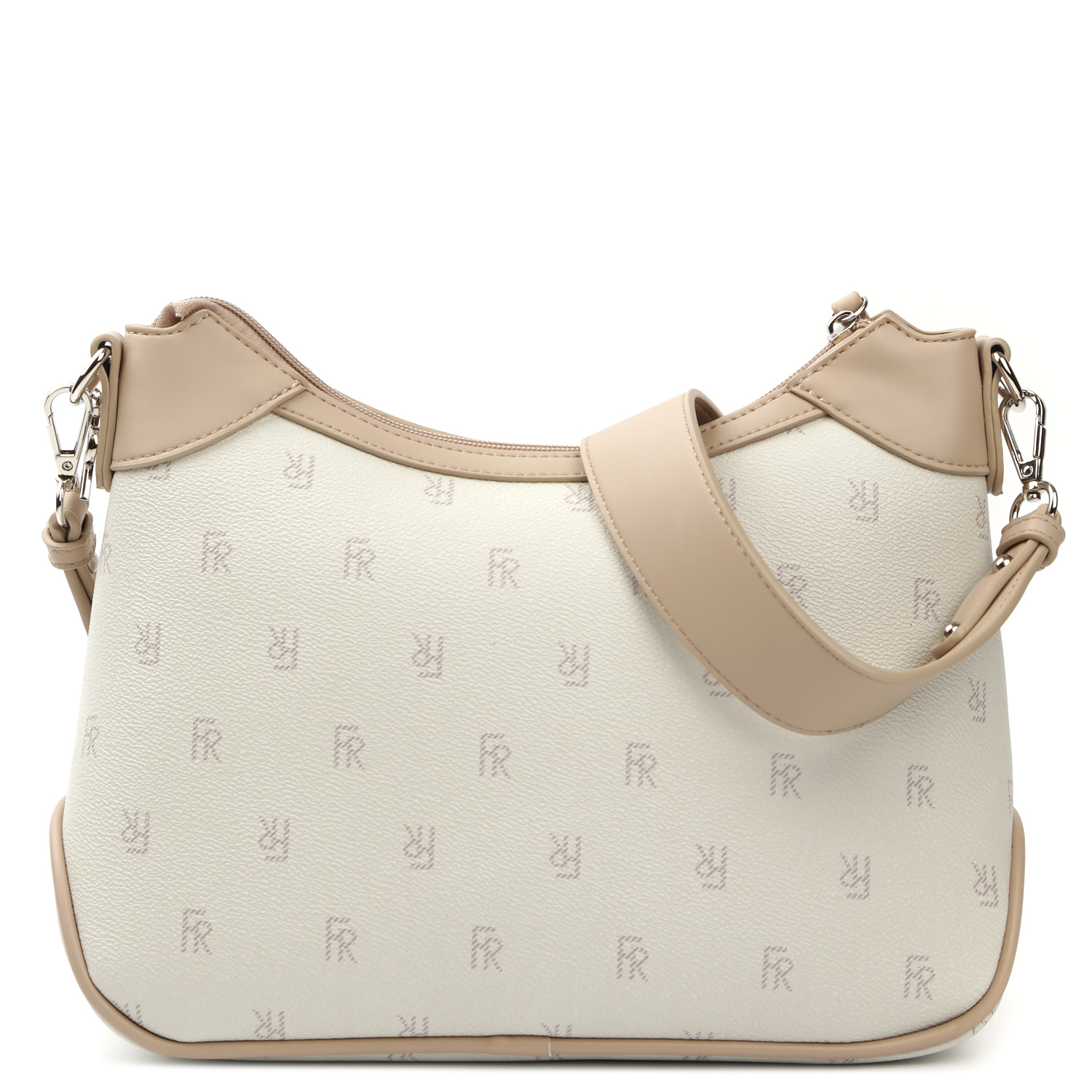 Оригинальная сумка на плечо FABRETTI в бежевом оттенке выполнена из экокожи зернистой фактуры и декорирована принтом с изображением монограмм бренда. Изделие прекрасно держит форму. Основное отделение закрывается на молнию. Внутри 2 боковых кармана для мелочей: открытый и на молнии. На тыльной стороне предусмотрен карман быстрого доступа на молнии. Плечевой ремень съемный, ширина - 4 см. Цвет фурнитуры - серебро.