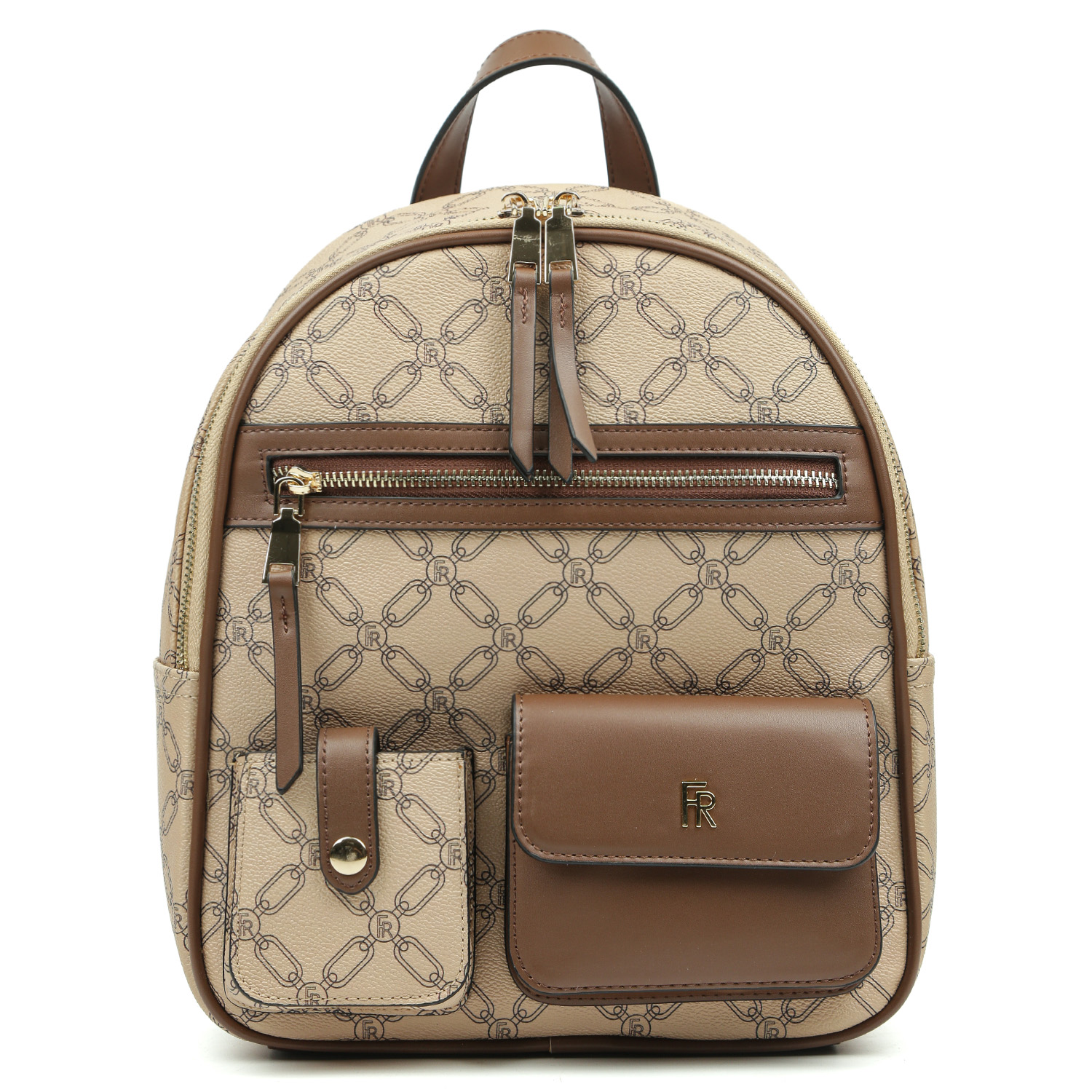 Стильный рюкзак FABRETTI в коричневом оттенке выполнен из экокожи зернистой фактуры и декорирован принтом в стиле «Логомания». Основное отделение закрывается на полукруглую молнию с 2 бегунками. Внутри есть 2 кармана для мелочей: открытый и на молнии. На лицевой стороне расположены 3 кармана различной вместимости: один закрывается клапаном с магнитной кнопкой, второй – на молнию, третий – хлястиком с кнопкой. На тыльной стороне предусмотрен вертикальный карман быстрого доступа на молнии. Лямки регулируются по длине, ширина - 4,5 см. Цвет фурнитуры - золото.