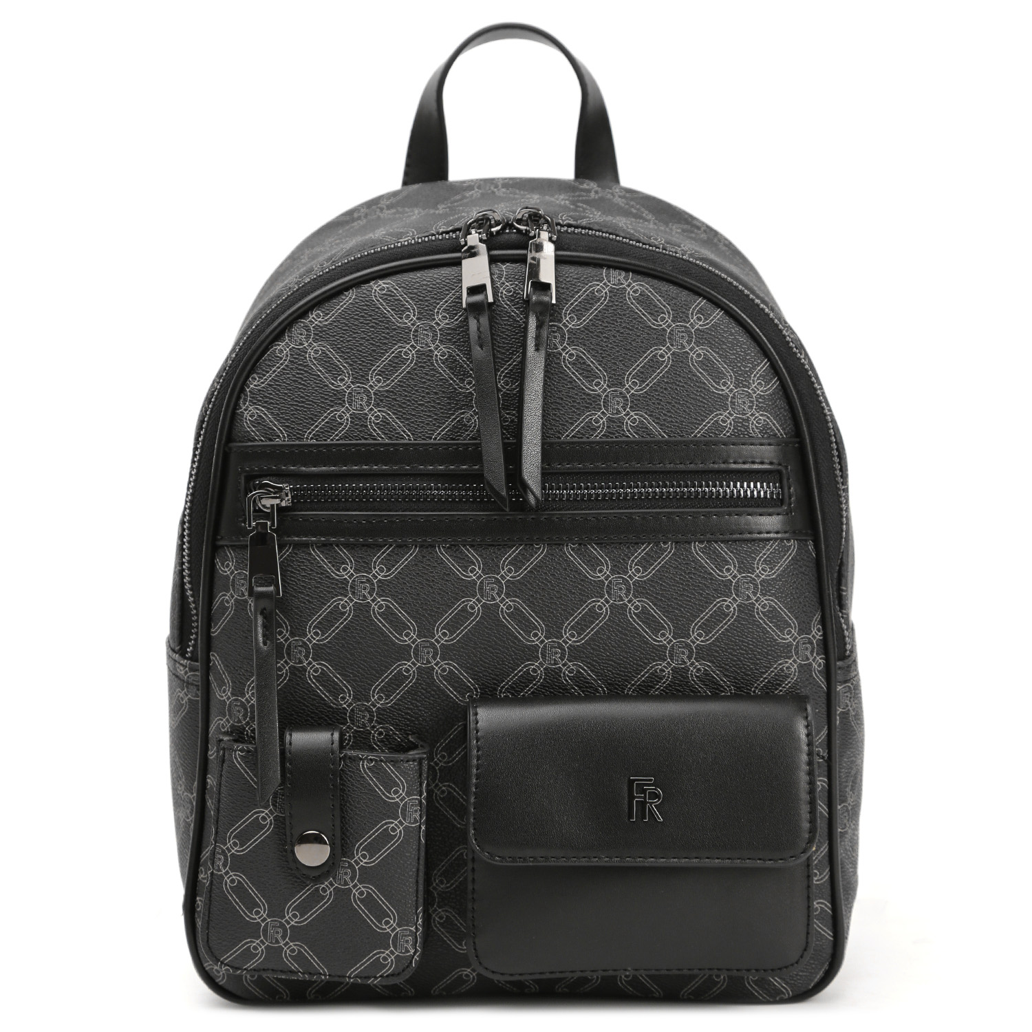 Стильный рюкзак FABRETTI в черном цвете выполнен из экокожи зернистой фактуры и декорирован принтом в стиле «Логомания». Основное отделение закрывается на полукруглую молнию с 2 бегунками. Внутри есть 2 кармана для мелочей: открытый и на молнии. На лицевой стороне расположены 3 кармана различной вместимости: один закрывается клапаном с магнитной кнопкой, второй – на молнию, третий – хлястиком с кнопкой. На тыльной стороне предусмотрен вертикальный карман быстрого доступа на молнии. Лямки регулируются по длине, ширина - 4,5 см. Цвет фурнитуры - черненый никель.