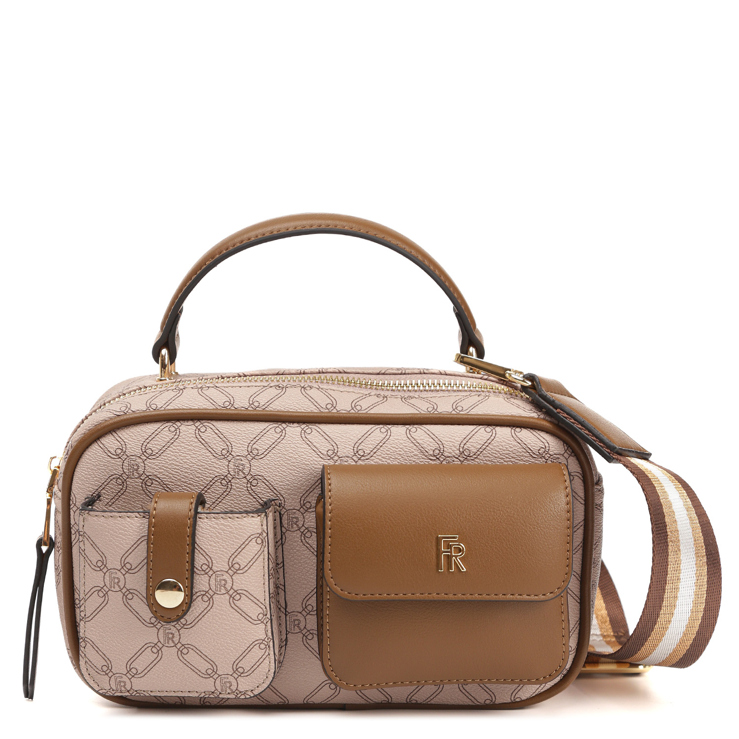Компактная кросс-боди FABRETTI в бежевом оттенке выполнена из экокожи зернистой фактуры и декорирована принтом в стиле «Логомания». Сумка закрывается на полукруглую молнию. Внутри есть 2 кармана для мелочей: открытый и на молнии. На лицевой стороне расположены 2 накладных кармана, один из которых закрывается клапаном на магнитной кнопке. На тыльной стороне предусмотрен карман быстрого доступа на магнитной кнопке. Сверху есть ручка, позволяющая комфортно носить аксессуар в руке. Текстильный плечевой ремень съемный, регулируется по длине, ширина - 3,5 см. Цвет фурнитуры - золото.