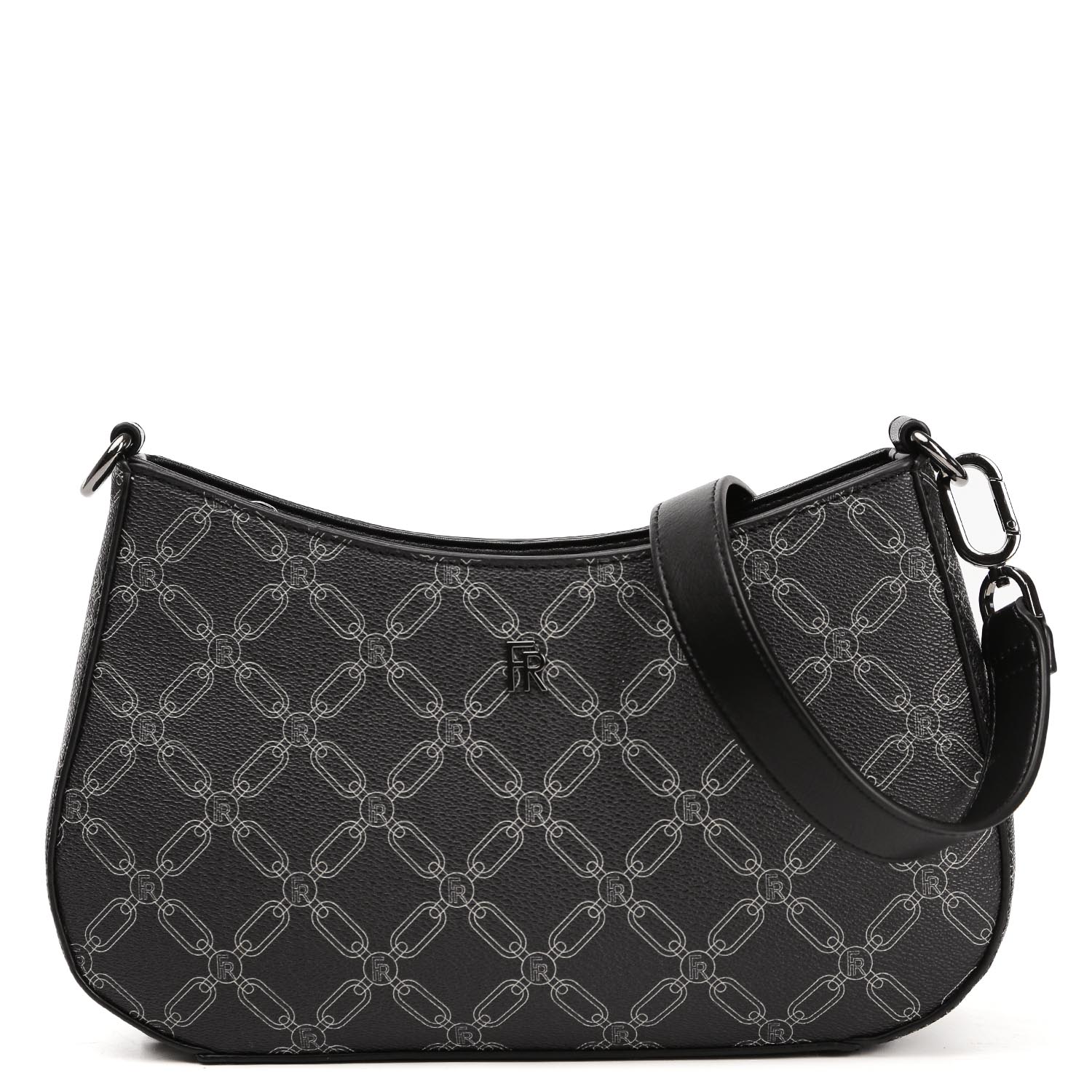 Компактная кросс-боди FABRETTI в черном цвете выполнена из экокожи зернистой фактуры и декорирована принтом в стиле «Логомания». Сумка закрывается на молнию с металлическим поводком. Внутри есть 2 кармана для мелочей: открытый и на молнии. Съемный плечевой ремень регулируется по длине, ширина - 2,5 см. Цвет фурнитуры - черненый никель.