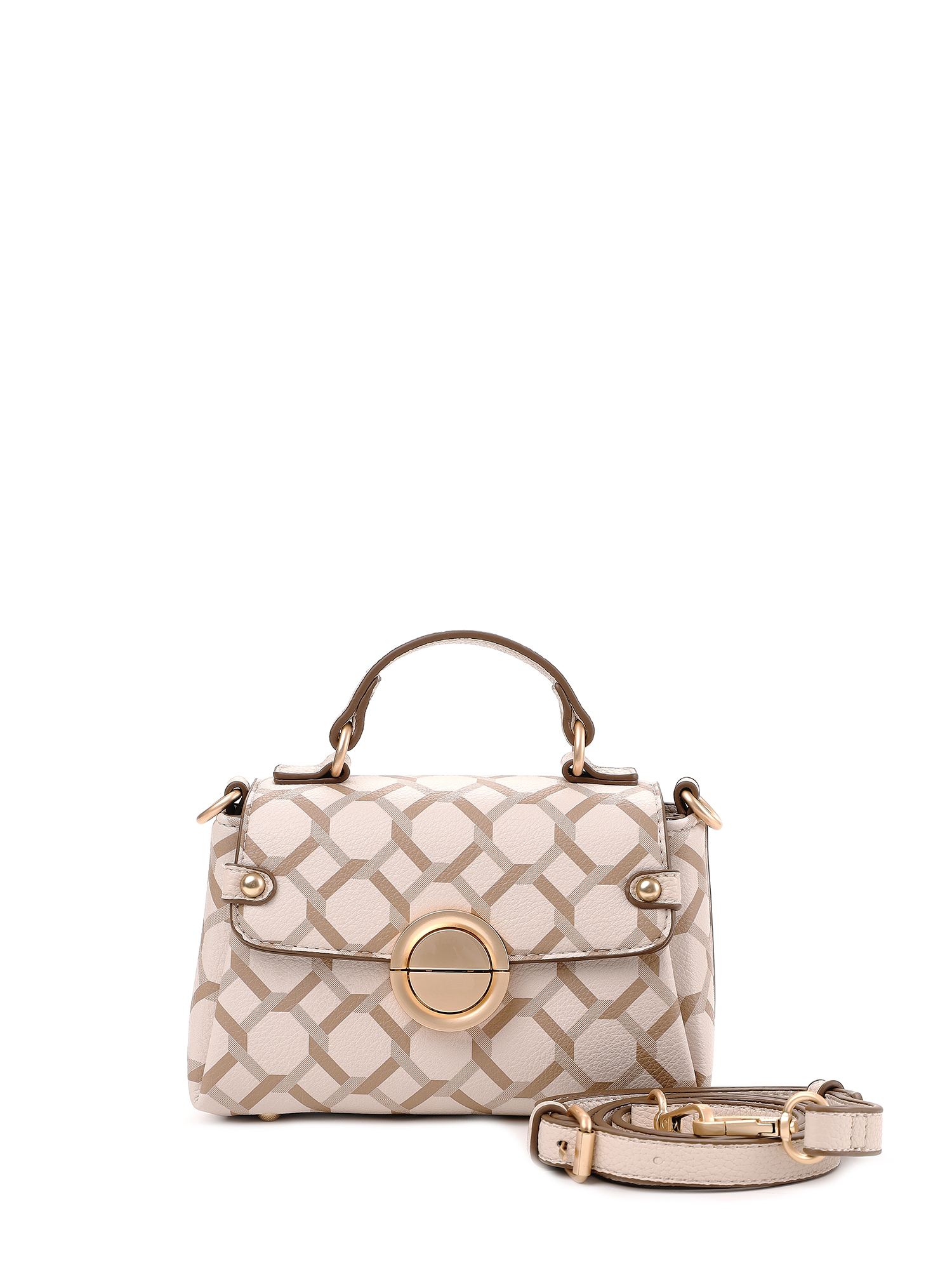 Миниатюрная женская сумка кросс-боди из коллекции итальянского бренда FABRETTI – впечатляющий аксессуар для городского образа. Трапециевидная сумочка с клапаном выполнена из мелкозернистой экокожи светло-бежевого оттенка и украшена лаконичным геометрическим узором. Края оформлены коричневым кантом; на клапане круглый металлический замок цвета матового золота, декоративные хлястики с кнопкой.