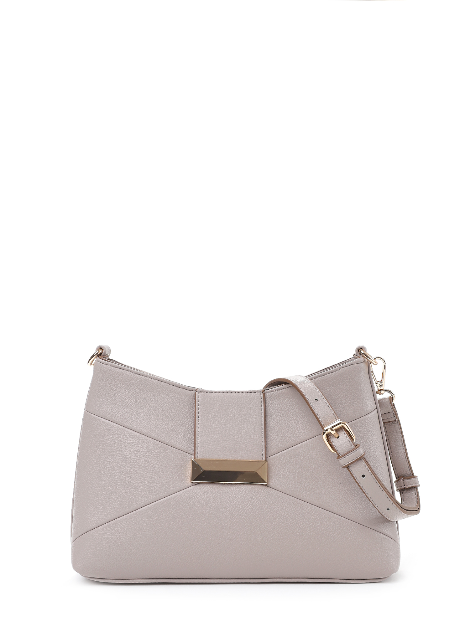 У сумки прямоугольный силуэт с небольшим изгибом в центре, строгую геометрию подчеркивают диагональные швы и декоративный хлястик с крупной металлической пряжкой на лицевой стороне. На тыльной стороне карман быстрого доступа.