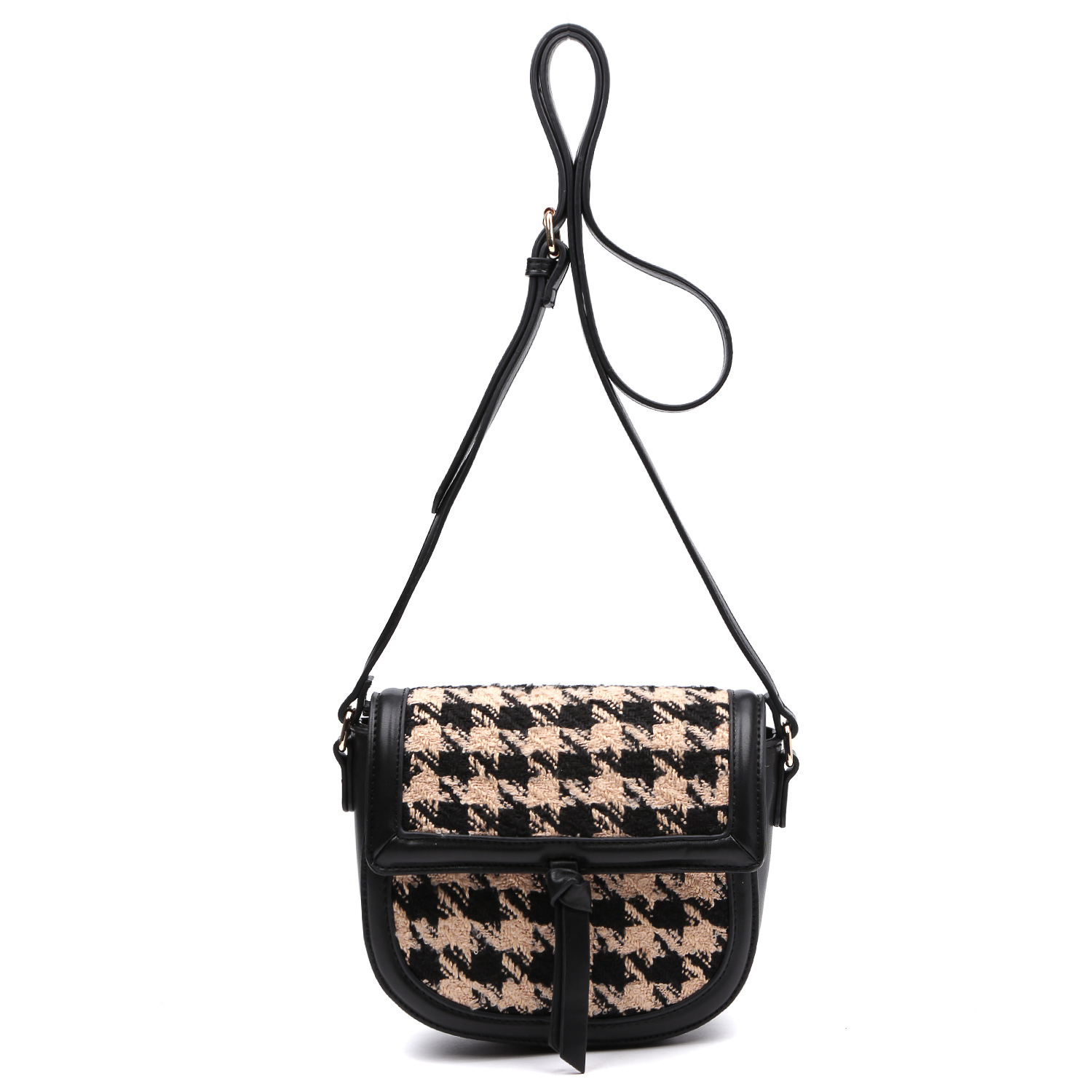 Компактная кросс-боди FABRETTI выполнена из гладкой экокожи в черном цвете. Аксессуар закрывается на клапан с магнитной кнопкой. Лицевая сторона декорирована вставкой из твида с узором "гусиная лапка" на бежевом фоне. Основное отделение закрывается на молнию. Внутри 2 боковых кармана для мелочей: открытый и на молнии. Плечевой ремень регулируется по длине. Цвет фурнитуры – золото.