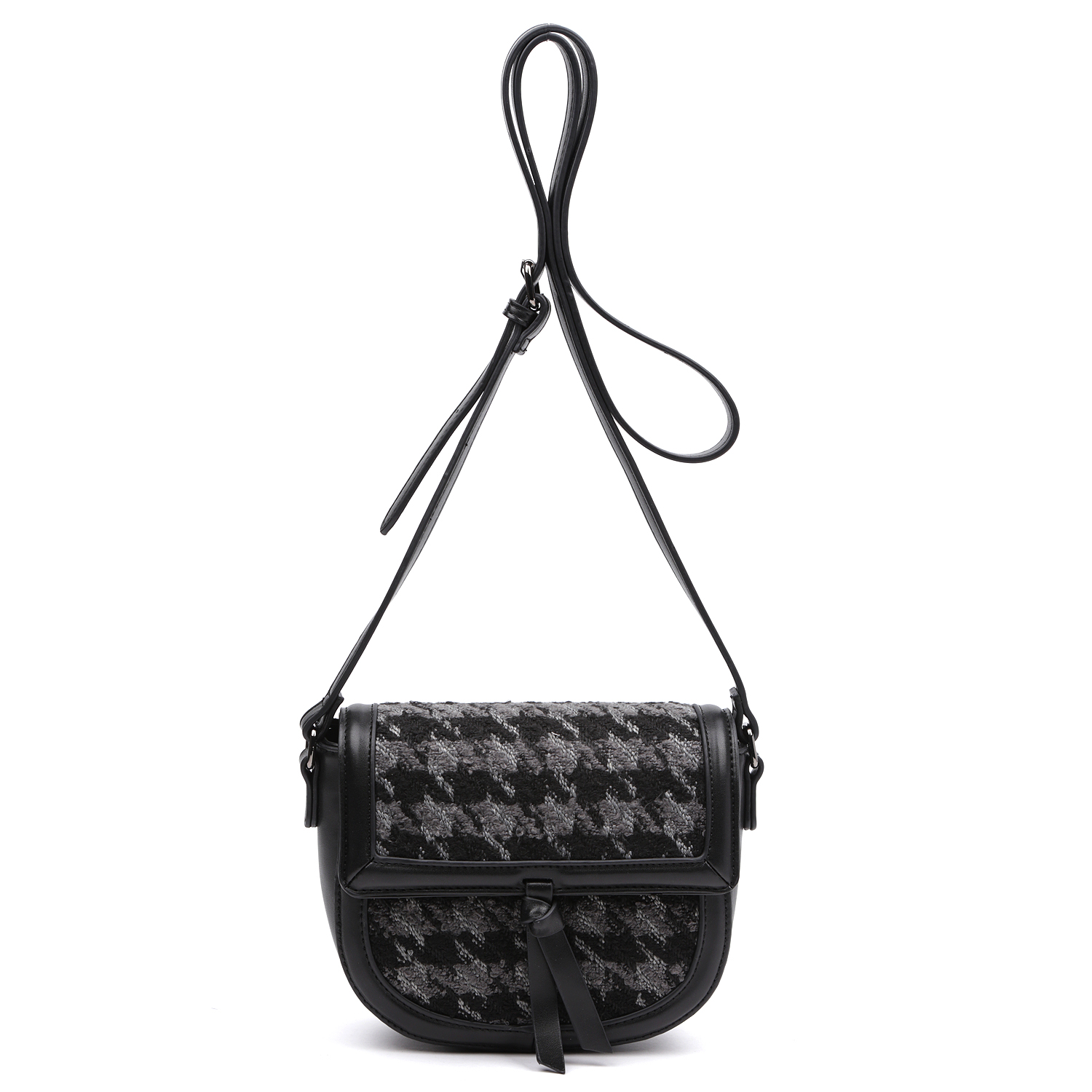 Компактная кросс-боди FABRETTI выполнена из гладкой экокожи в черном цвете. Аксессуар закрывается на клапан с магнитной кнопкой. Лицевая сторона декорирована вставкой из твида с узором "гусиная лапка" темно-сером фоне. Основное отделение закрывается на молнию. Внутри 2 боковых кармана для мелочей: открытый и на молнии. Плечевой ремень регулируется по длине. Цвет фурнитуры – черненый никель.