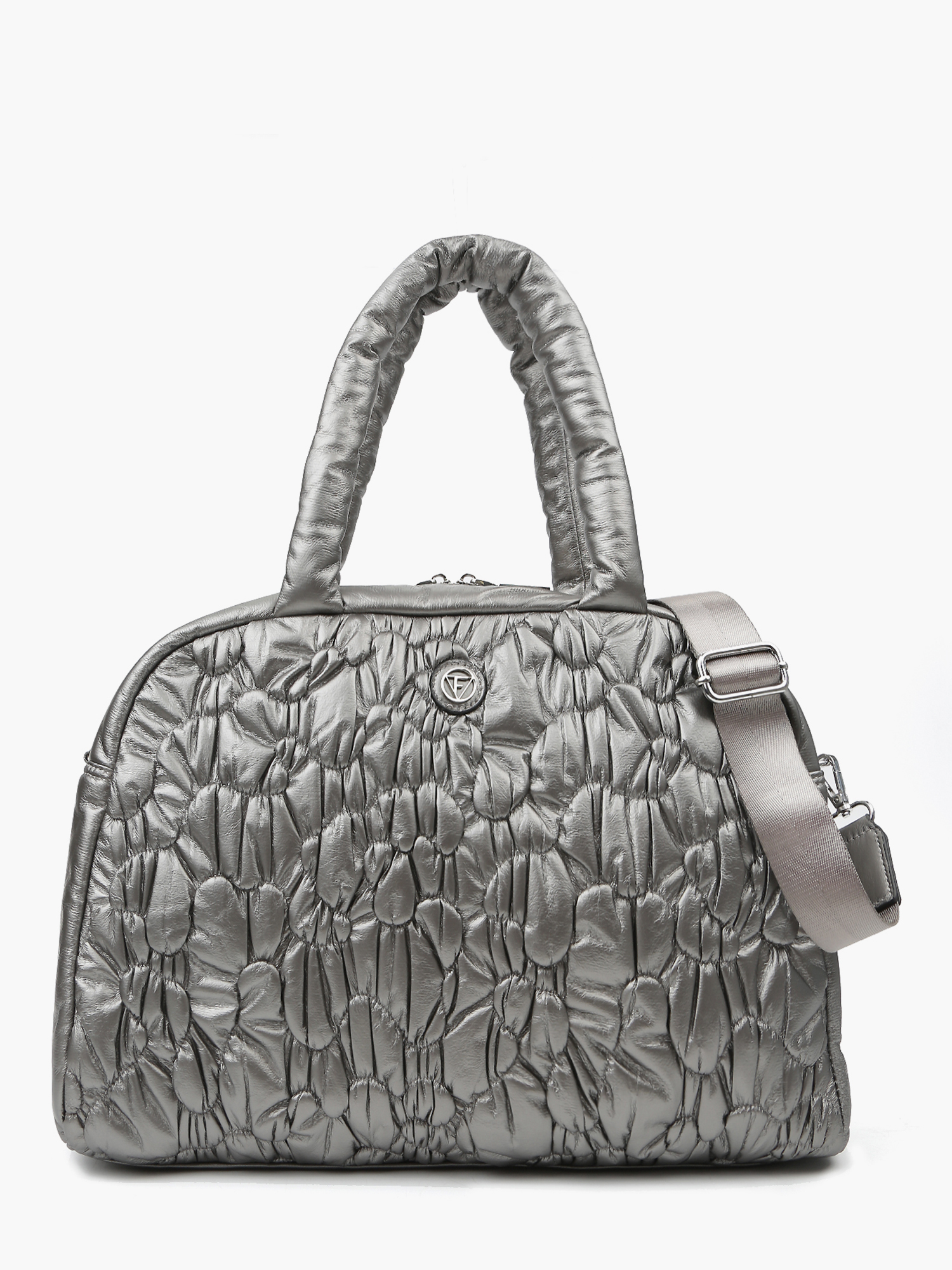 Женская стеганая дутая дорожная сумка среднего размера итальянского бренда FABRETTI выполнена из высокотехнологичного полиэстера, устойчивого к влаге и перепадам температур, в оттенке серый металлик с отделкой из экокожи. Гладкая фактура дополнена абстрактной стежкой с элементами драпировки на лицевой стороне. Основное отделение закрывается на молнию. Внутри расположены два открытых кармана и карман на молнии. Модель оснащена двумя ручками длиной 50 см и съёмным регулируемым текстильным ремнём длиной 91–139 см и шириной 3,8 см. Цвет фурнитуры — серебро. Стильный и функциональный вариант для путешествий и активных поездок.