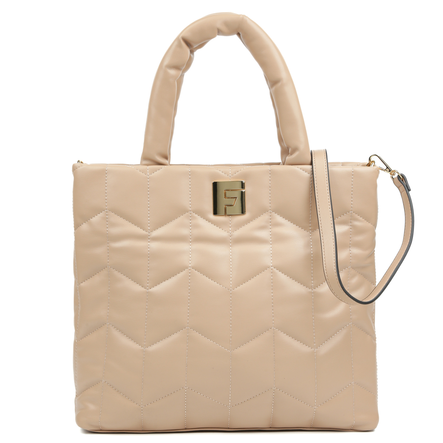 Стильный объемный шоппер FABRETTI в бежевом оттенке выполнен из экокожи гладкой текстуры и декорирован геометрической стёжкой. Сумка закрывается на молнию с металлическим поводком. Внутри 3 боковых кармана: 2 открытых и 1 на молнии. Две ручки отличаются мягкостью фактуры и позволяют носить сумку на плече. В комплекте идёт съемный ремень, регулируемый по длине, ширина - 2 см. Цвет фурнитуры - золото.