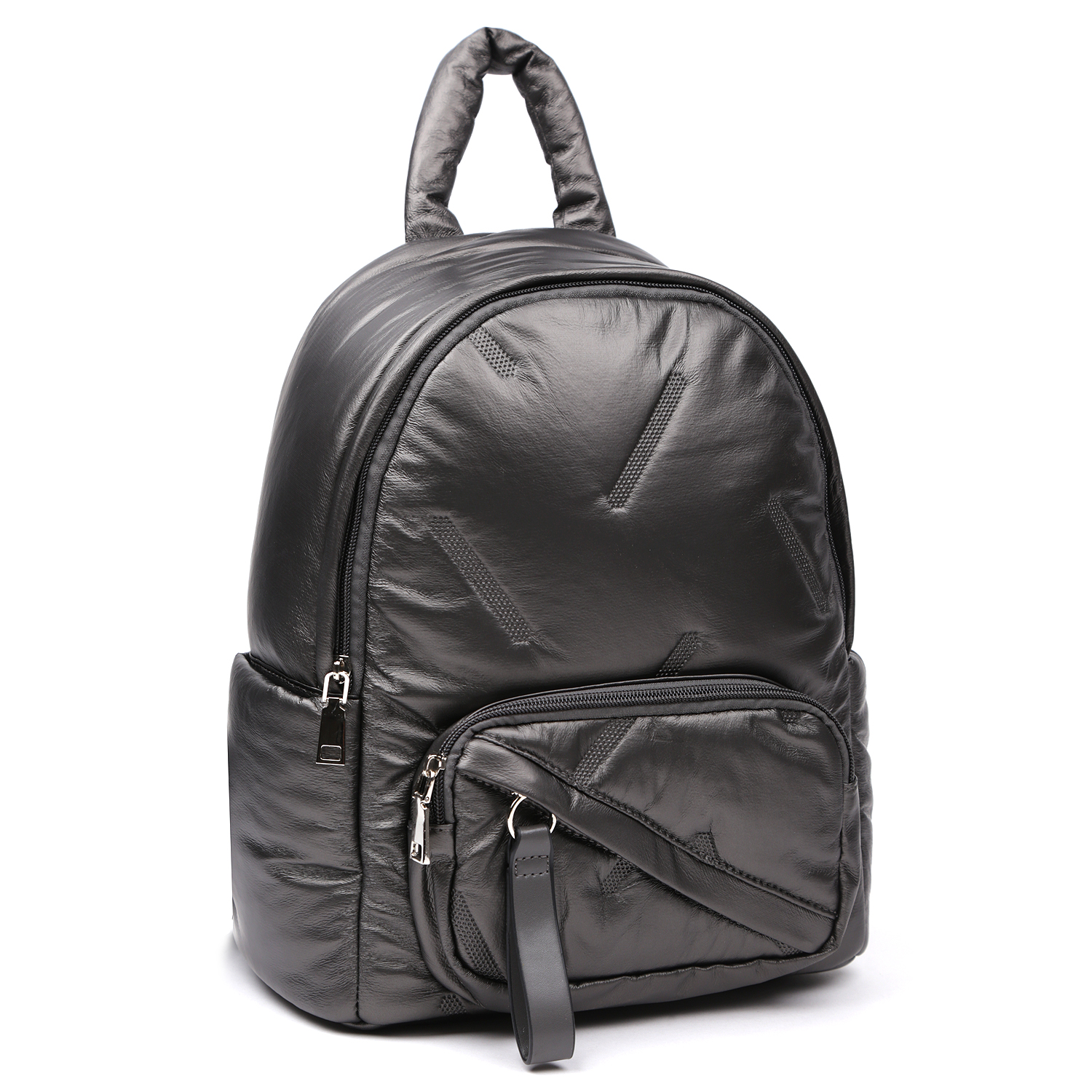 Оригинальный дутый рюкзак FABRETTI выполнен из экокожи темно-серого цвета. Высокотехнологичный материал на полиуретановой основе обладает водоотталкивающими свойствами, устойчив к температурным перепадам до -25 C, приятен на ощупь. Основное отделение закрывается на молнию с удобным поводком. Внутри есть 3 боковых кармана для мелочей: 2 открытых и на молнии. На лицевой стороне предусмотрены 2 кармана быстрого доступа: накладной и диагональный. В качестве декора использовано геометрическое тиснение. На тыльной стороне расположен потайной вертикальный карман на молнии. По бокам предусмотрены открытые карманы. Лямки средней ширины легко регулируются по длине. Сверху есть ручка, позволяющая комфортно носить изделие в руке.