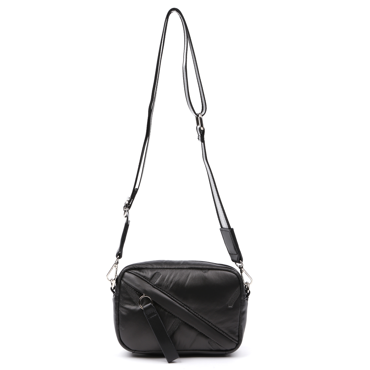 Компактная дутая кросс-боди FABRETTI выполнена из экокожи черного цвета. Высокотехнологичный материал на полиуретановой основе обладает водоотталкивающими свойствами, устойчив к температурным перепадам до -25 C, приятен на ощупь. Основное отделение закрывается на молнию с удобным поводком. Внутри 2 боковых кармана для мелочей: открытый и на молнии. На лицевой стороне предусмотрен диагональный карман быстрого доступа на молнии. В качестве декора использовано геометрическое тиснение. Текстильный плечевой ремень съемный, легко регулируется по длине.