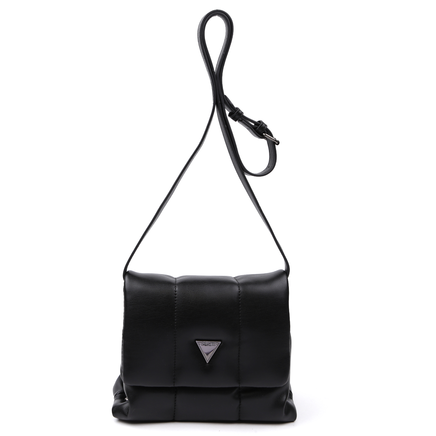 Стильная кросс-боди FABRETTI выполнена из стёганой экокожи черного цвета. Сумка закрывается клапаном с 2 магнитными кнопками. Внутри 2 боковых кармана для мелочей: открытый и на молнии. По бокам предусмотрены кнопки для регулирования объема. Съемный плечевой ремень регулируется по длине.