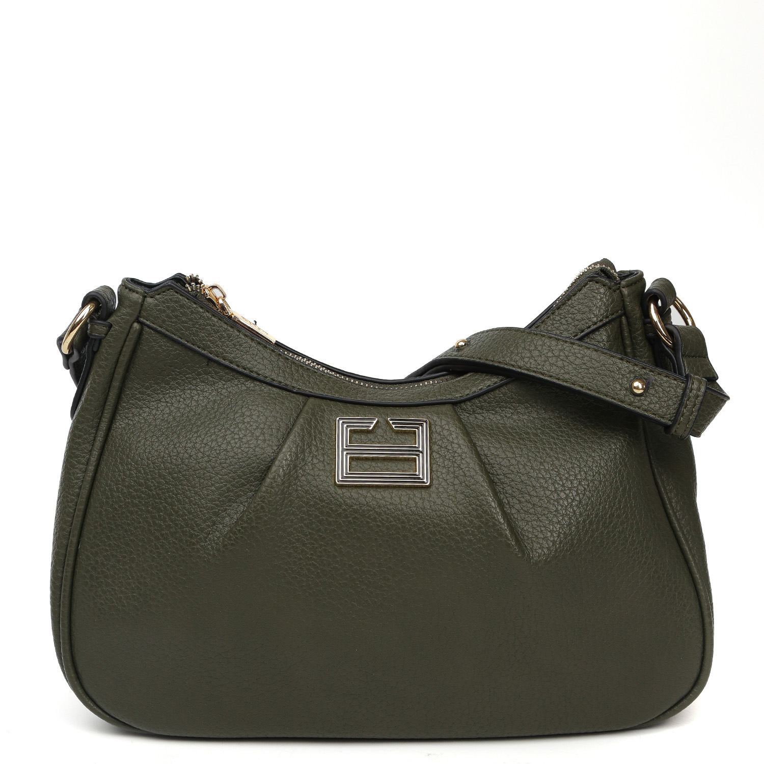 Сумка на плечо FABRETTI в зеленом оттенке выполнена из экокожи зернистой текстуры. Основное отделение закрывается на полукруглую молнию с металлическим поводком. Внутри 2 кармана для мелочей: открытый и на молнии. На тыльной стороне предусмотрен карман быстрого доступа на молнии. Лицевая сторона декорирована защипами, образующими две аккуратные складки, и крупной фурнитурой в виде монограммы бренда. Плечевой ремень регулируется по длине, ширина - 2 см. Цвет фурнитуры - черненый никель.