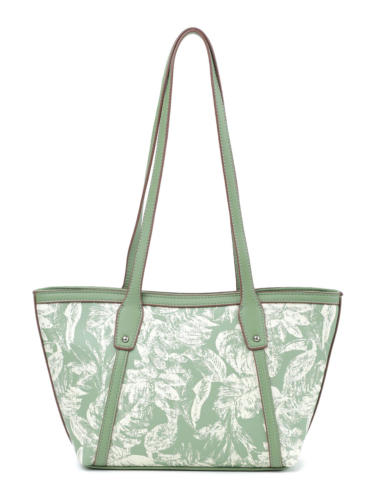 Необычная небольшая городская сумка тоут из коллекции итальянского бренда FABRETTI из светло-зеленой экокожи с растительным узором и отделкой из однотонной зернистой экокожи. Компактный вариант для повседневного гардероба, который отлично подойдет к однотонной одежде светлых и природных тонов. У сумки классическая форма трапеции с узким основанием, широкое дно и жесткий каркас, хорошо сохраняющий форму. Основное отделение закрывается на молнию, внутри открытый карман и на молнии. На тыльной стороне карман быстрого доступа на молнии. Поверхность украшена стилизованным принтом в виде листьев растений. Цвет фурнитуры – серебро.
