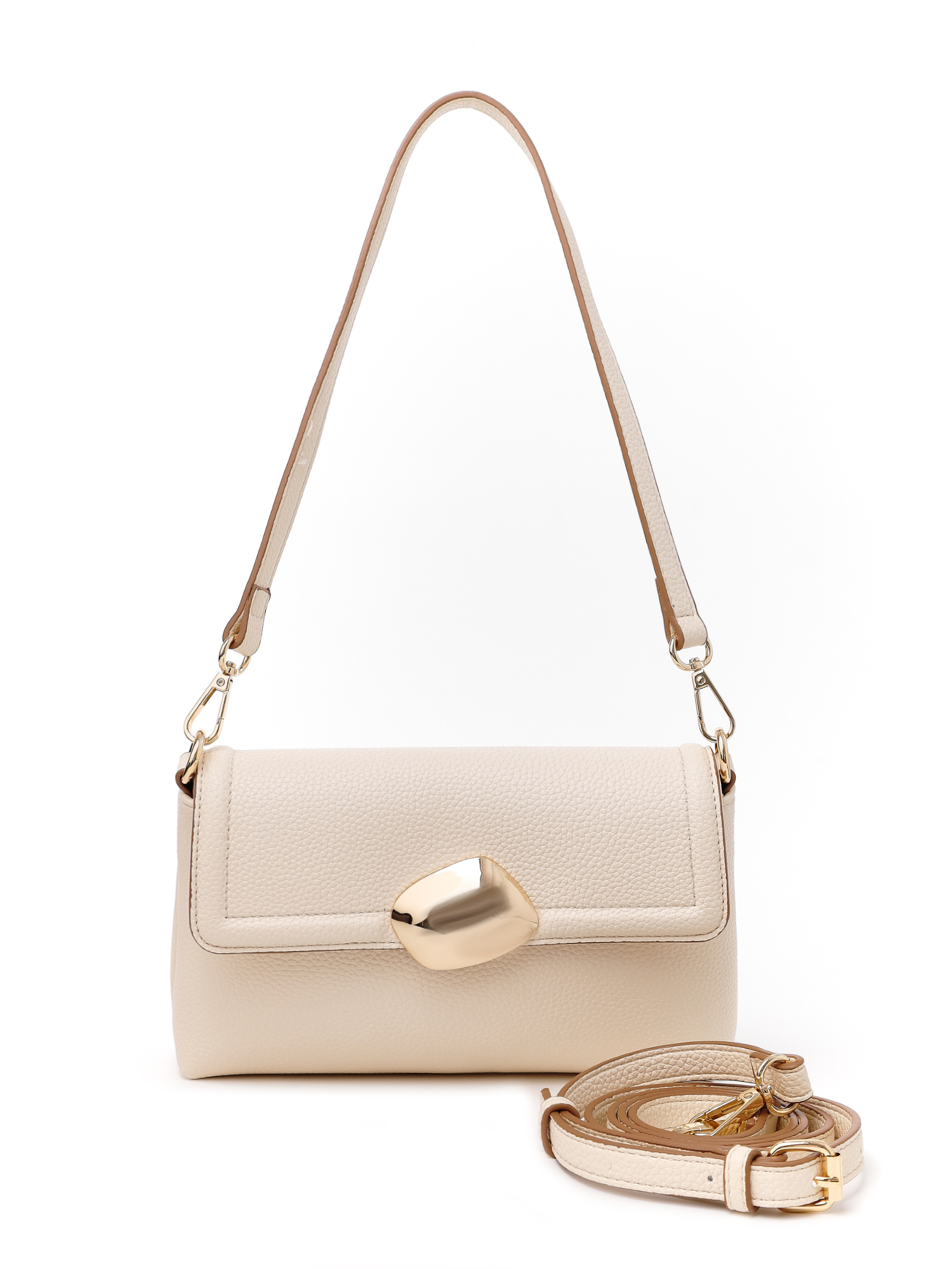 Лаконичная городская сумка кросс-боди итальянского бренда FABRETTI из высококачественной экокожи светло-бежевого оттенка с зернистой фактурой. Простой классический дизайн делает модель универсальным аксессуаром под любой образ, эффектным акцентом служит объемная металлическая вставка на клапане сумки.