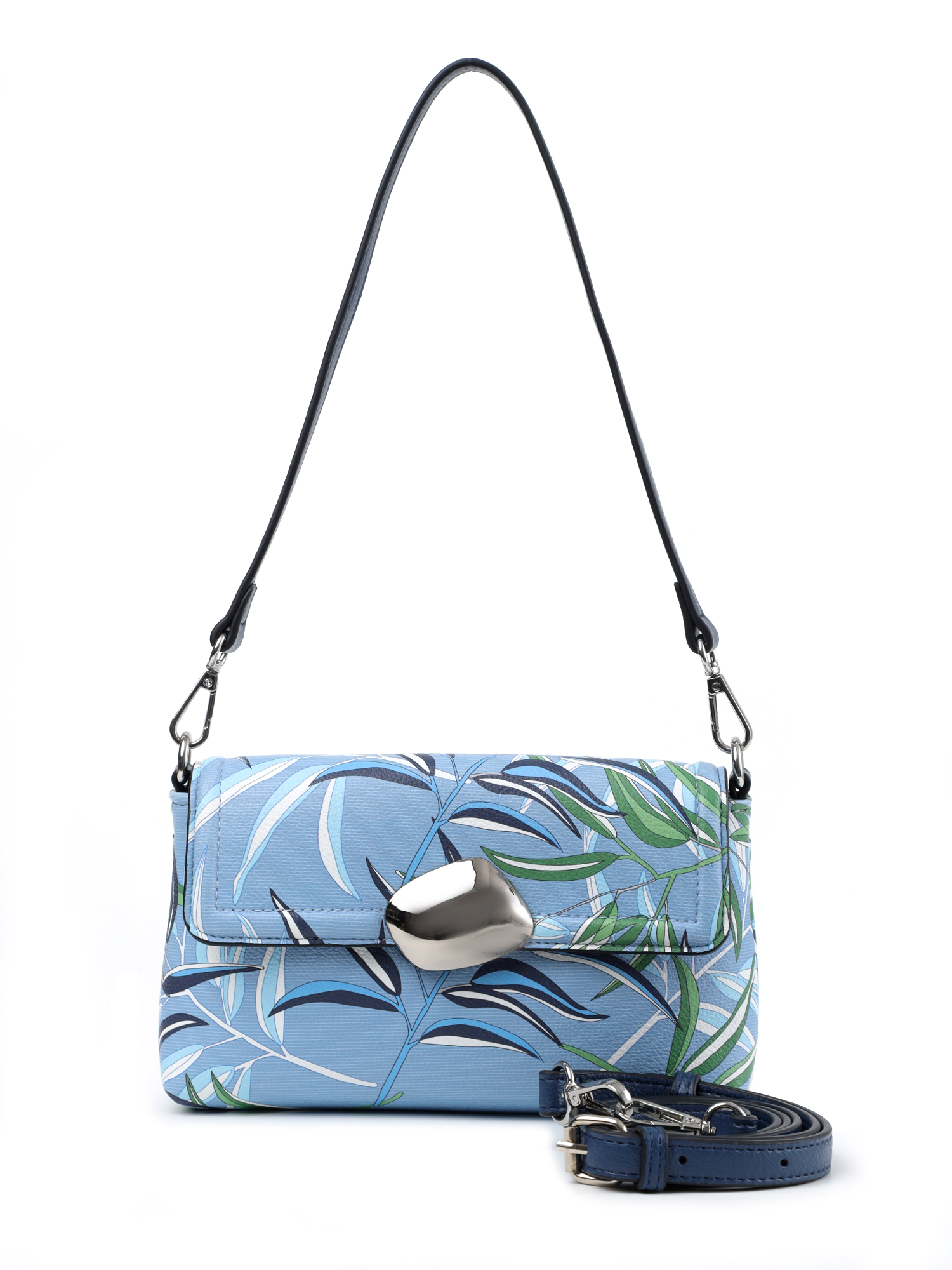Лаконичная городская сумка кросс-боди итальянского бренда FABRETTI из высококачественной экокожи нежного голубого цвета с зернистой фактурой и растительными принтами. Простой классический дизайн делает модель универсальным аксессуаром под любой летний образ. Эффектным акцентом служит объемная металлическая вставка на клапане сумки, а графичный принт в виде бамбуковых веток создает романтическое настроение в образе.