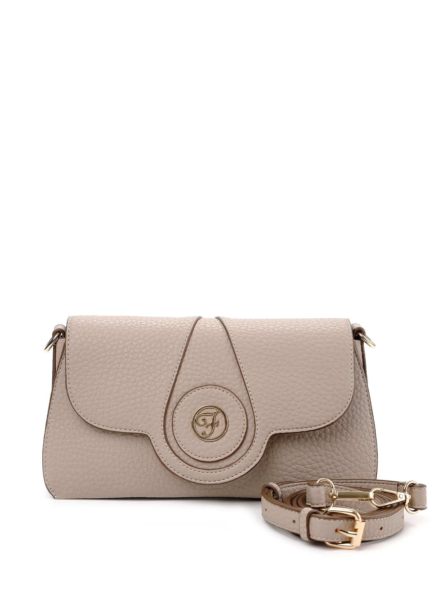Небольшая женская сумочка кросс-боди итальянского бренда FABRETTI в романтичном дизайне с удобной внутренней организацией пространства. Крупнозернистая экокожа окрашена в теплый кофейно-бежевый оттенок, срезы отделаны в тон темно-бежевым кантом. Клапан украшен украшен изящной металлической монограммой и каплевидным вырезом с отстрочкой – лаконично и элегантно.