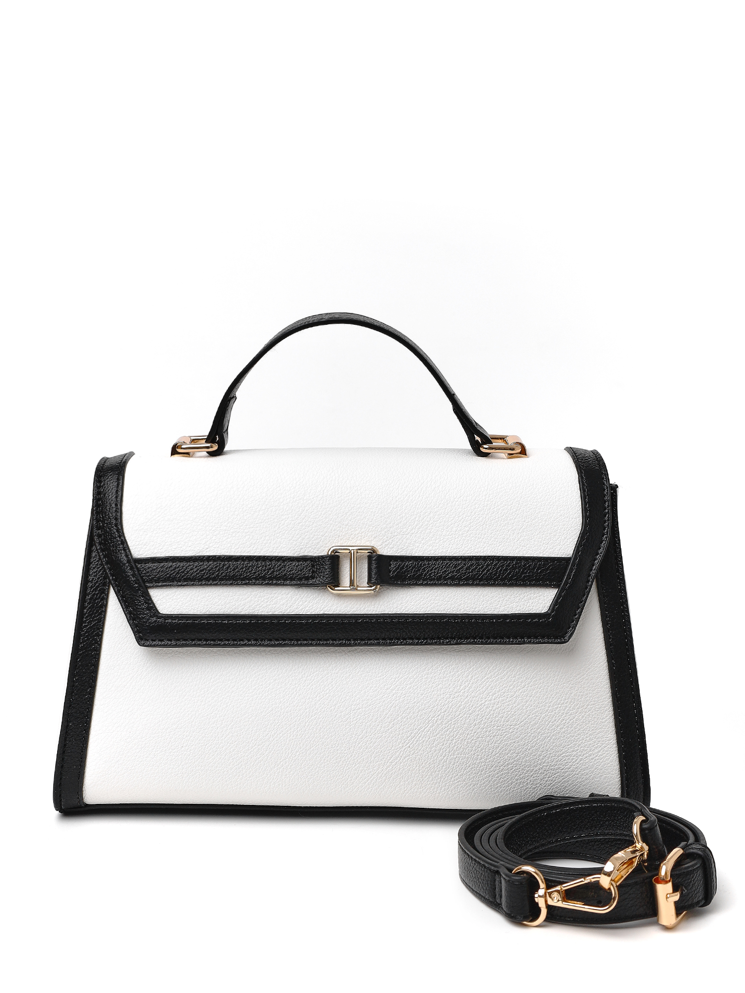 Строгая модель играет на контрастах – белая база сочетается с черной отделкой. Клапан дополнен небольшой золотой пряжкой, короткая ручка имеет фурнитуру из золотистого гальванического сплава.
