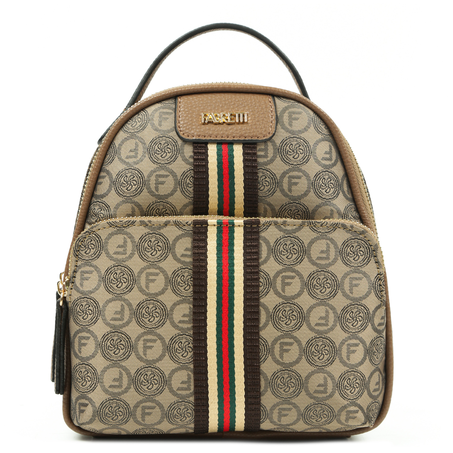 Компактный рюкзак FABRETTI в коричневом оттенке декорирован узором в стиле "Логомания". Рюкзак выполнен из высокотехнологичного полиэстера с текстурой жаккард, устойчивого к воздействию влаги и перепаду температур. Основное отделение закрывается на полукруглую молнию. Внутри 2 боковых кармана для мелочей: открытый и на молнии. На лицевой стороне расположен накладной карман на полукруглой молнии. В качестве украшения выбрана контрастная текстильная лента. На тыльной стороне есть вертикальный карман быстрого доступа. Лямки (ширина - 1 см) регулируются по длине. Цвет фурнитуры - золото.