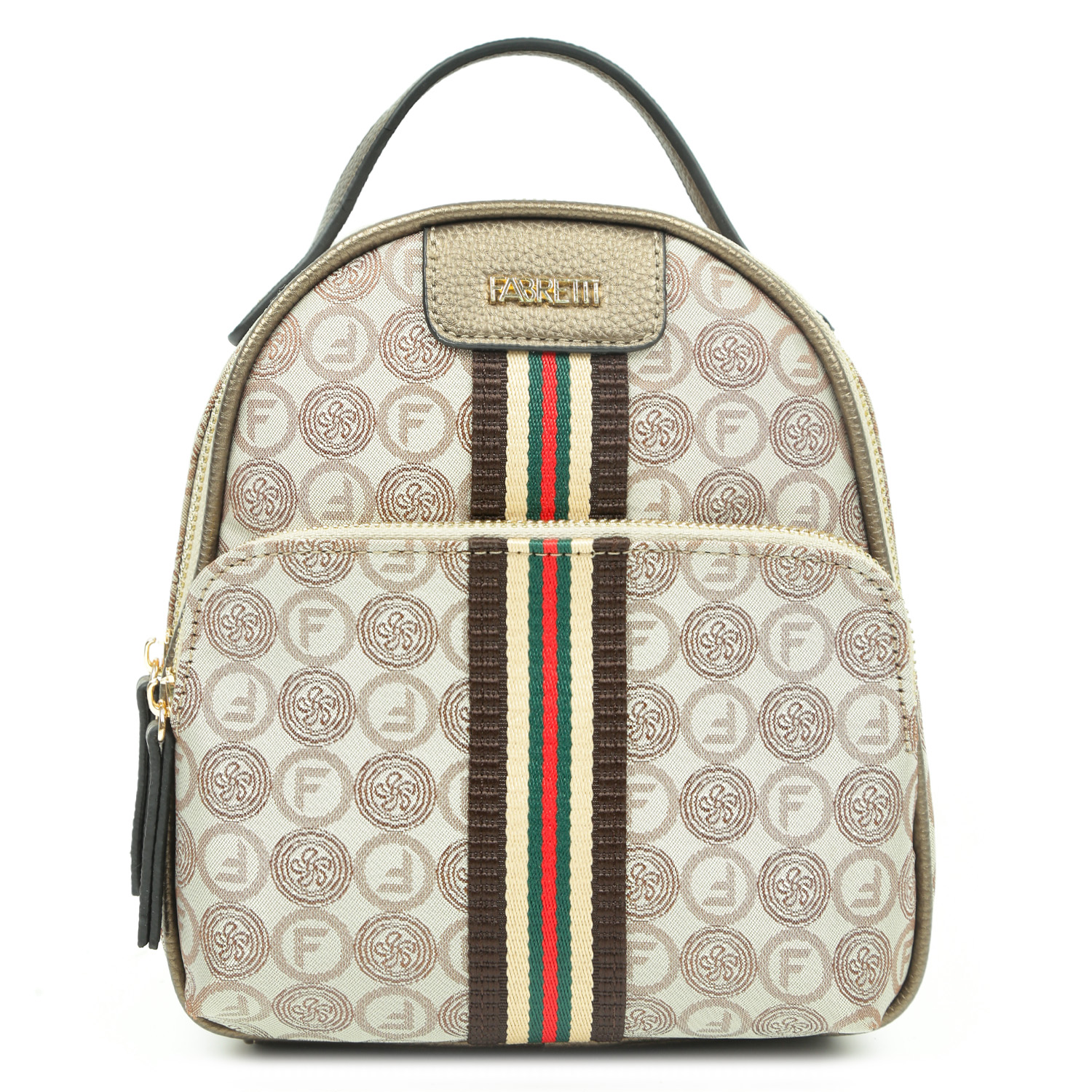 Компактный рюкзак FABRETTI в бежевом оттенке декорирован узором в стиле "Логомания". Рюкзак выполнен из высокотехнологичного полиэстера с текстурой жаккард, устойчивого к воздействию влаги и перепаду температур. Основное отделение закрывается на полукруглую молнию. Внутри 2 боковых кармана для мелочей: открытый и на молнии. На лицевой стороне расположен накладной карман на полукруглой молнии. В качестве украшения выбрана контрастная текстильная лента. На тыльной стороне есть вертикальный карман быстрого доступа. Лямки (ширина - 1 см) регулируются по длине. Цвет фурнитуры - золото.