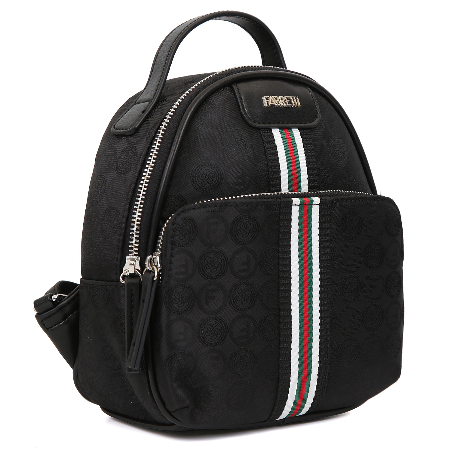 В ритме городской жизни женщины особенно ценят при выборе аксессуаров комфорт и стильное оформление. При создании этого рюкзака дизайнеры FABRETTI учли эти главные пожелания, в результате чего появился компактный, очень стильный, очень "женский" рюкзак. Он прекрасно сочетается как со спортивным образом, так и с брючным комплектом, платьем или юбкой. В его оформлении использован стиль "логомания". Яркий акцент аксессуару придает текстильная полоса на лицевой стороне. Рюкзак имеет один карман, закрывающийся на молнию. На тыльной стороне также есть карман на вертикальной молнии. Основное отделение модели закрывается на молнию и имеет 2 боковых кармана для мелочей.