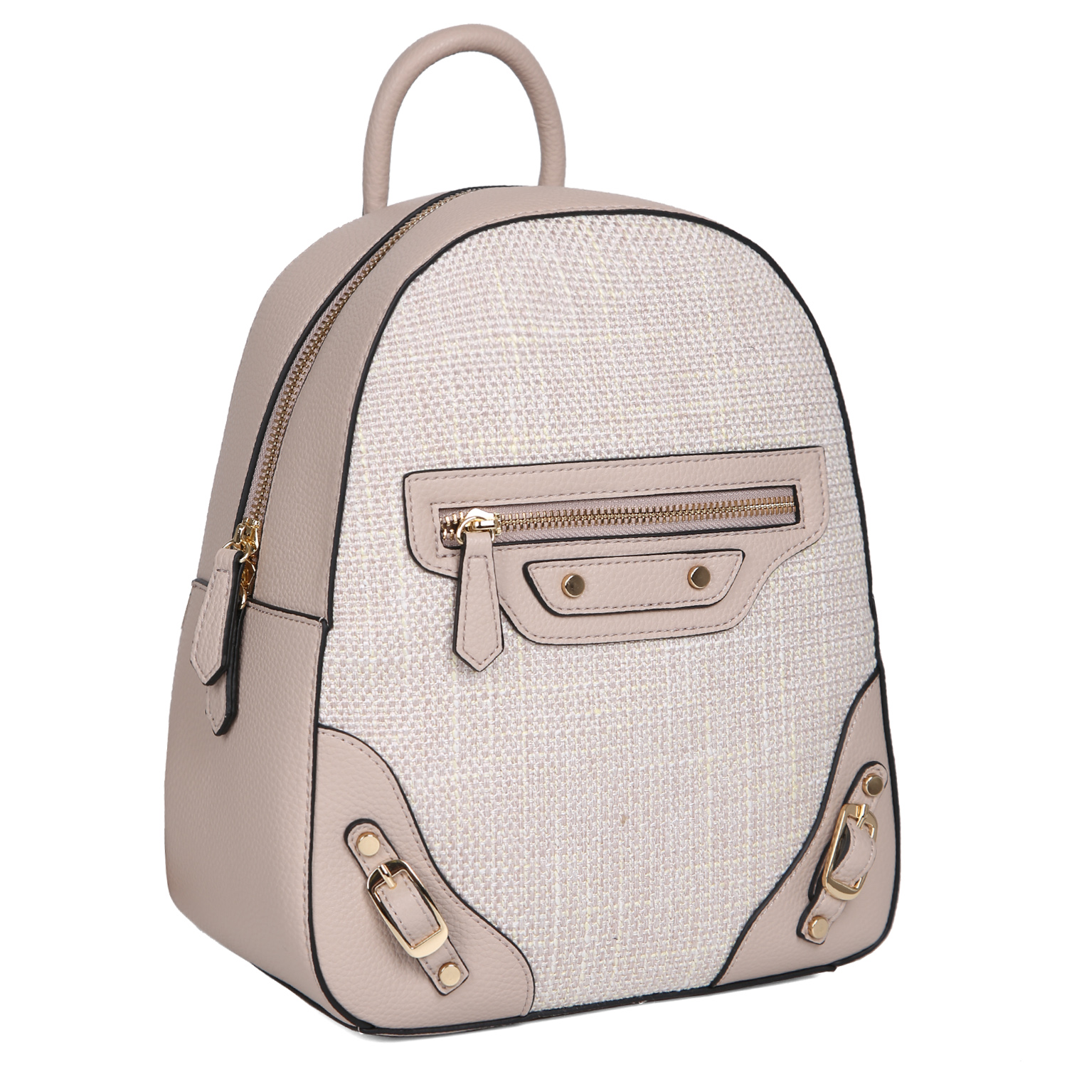 Рюкзак FABRETTI среднего размера выполнен из экокожи в бежевом цвете. Лицевая сторона декорирована текстильной вставкой в том же тоне и миниатюрными элементами в виде застёгнутых ремешков, а также дополнена карманом быстрого доступа на молнии. Основное отделение закрывается на молнию с 2 удобными поводками. Внутри 2 боковых кармана для мелочей: открытый и на молнии. На тыльной стороне предусмотрен верикальный карман на молнии. Узкие лямки регулируются по длине. Сверху есть удобная ручка, которая позволяет носить аксессуар в руке. Фурнитура под золото гармонично дополняет дизайн изделия. Модель не вмещает формат А4.