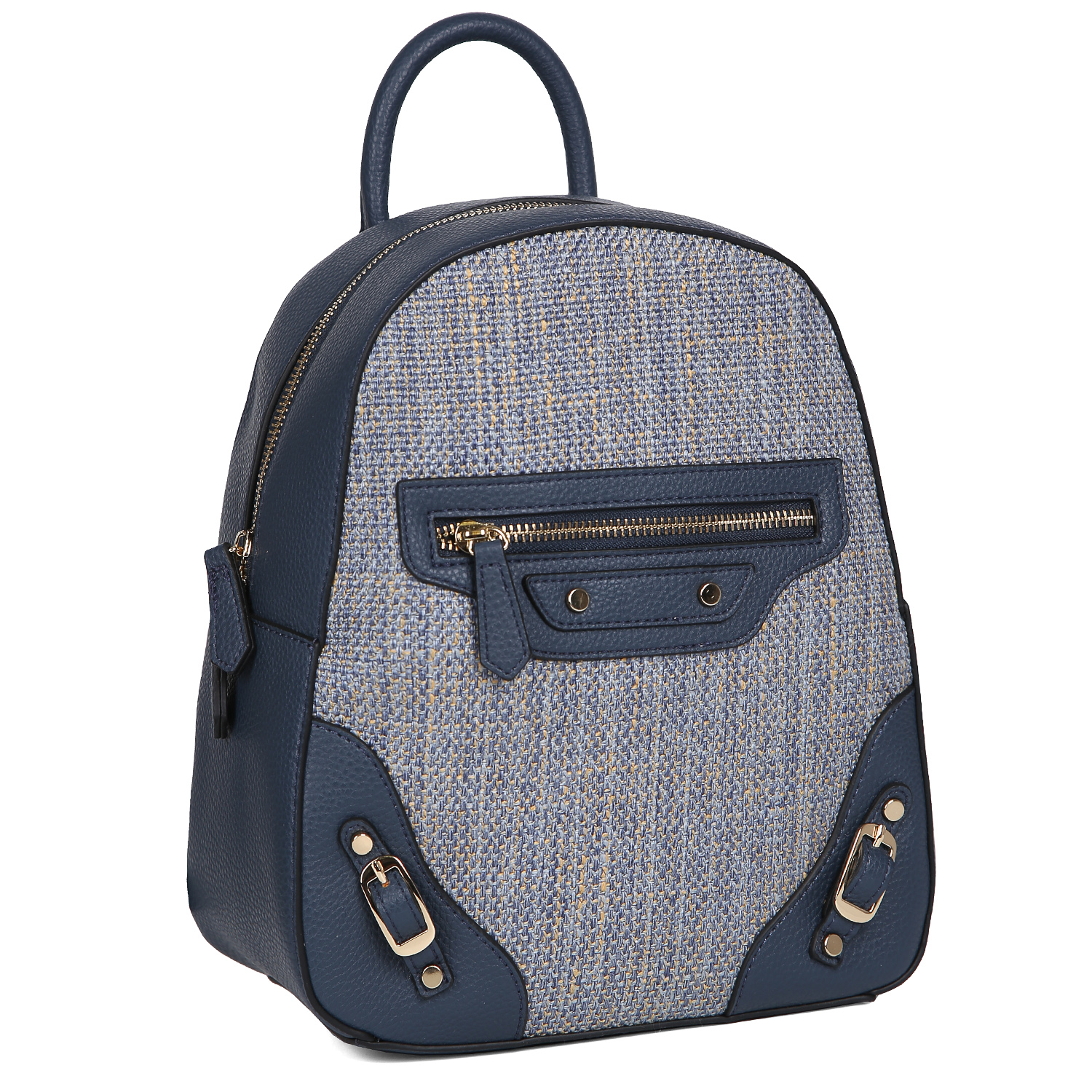 Рюкзак FABRETTI среднего размера выполнен из экокожи в синем цвете. Лицевая сторона декорирована текстильной вставкой в том же тоне и миниатюрными элементами в виде застёгнутых ремешков, а также дополнена карманом быстрого доступа на молнии. Основное отделение закрывается на молнию с 2 удобными поводками. Внутри 2 боковых кармана для мелочей: открытый и на молнии. На тыльной стороне предусмотрен верикальный карман на молнии. Узкие лямки регулируются по длине. Сверху есть удобная ручка, которая позволяет носить аксессуар в руке. Фурнитура под золото гармонично дополняет дизайн изделия. Модель не вмещает формат А4.