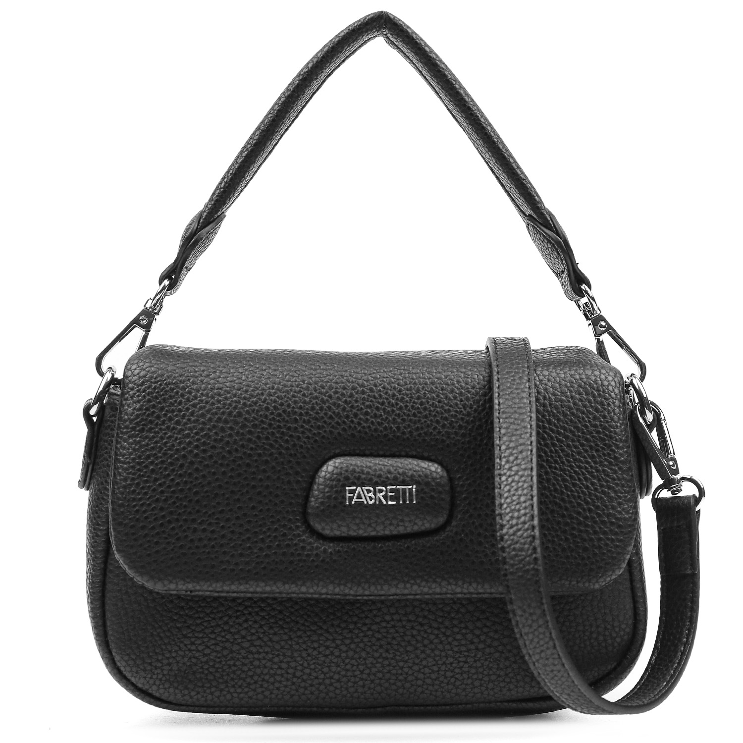 Компактная кросс-боди FABRETTI в черном цвете выполнена из экокожи зернистой фактуры. Сумка закрывается клапаном с 2 магнитными кнопками. Внутри есть 2 кармана для мелочей: открытый и на молнии. В комплект входят 2 съемных плечевых ремня: длина первого - 32 см, ширина – 2,5 см; второй - регулируется по длине, ширина - 1,5 см. Цвет фурнитуры - серебро.