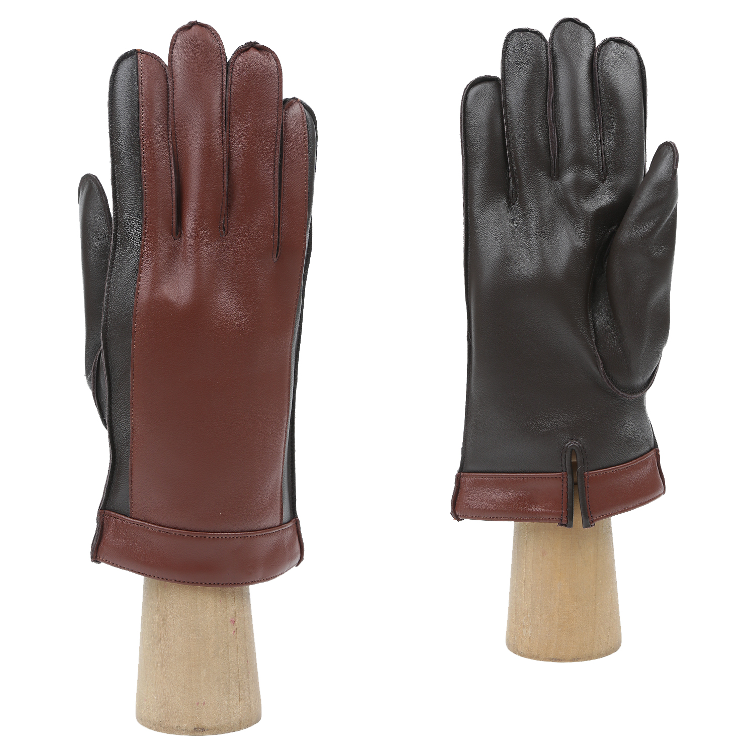 На тыльной стороне небольшая шлица для комфортного надевания и цветная отделка манжет, лицевая сторона декорирована вставкой цветной кожи. Благодаря ней, рука в перчатке смотрится более изящно. Особенность этой пары – наружные швы, благодаря которым перчатки сидят на руке максимально комфортно. Прекрасный вариант для морозной зимы.