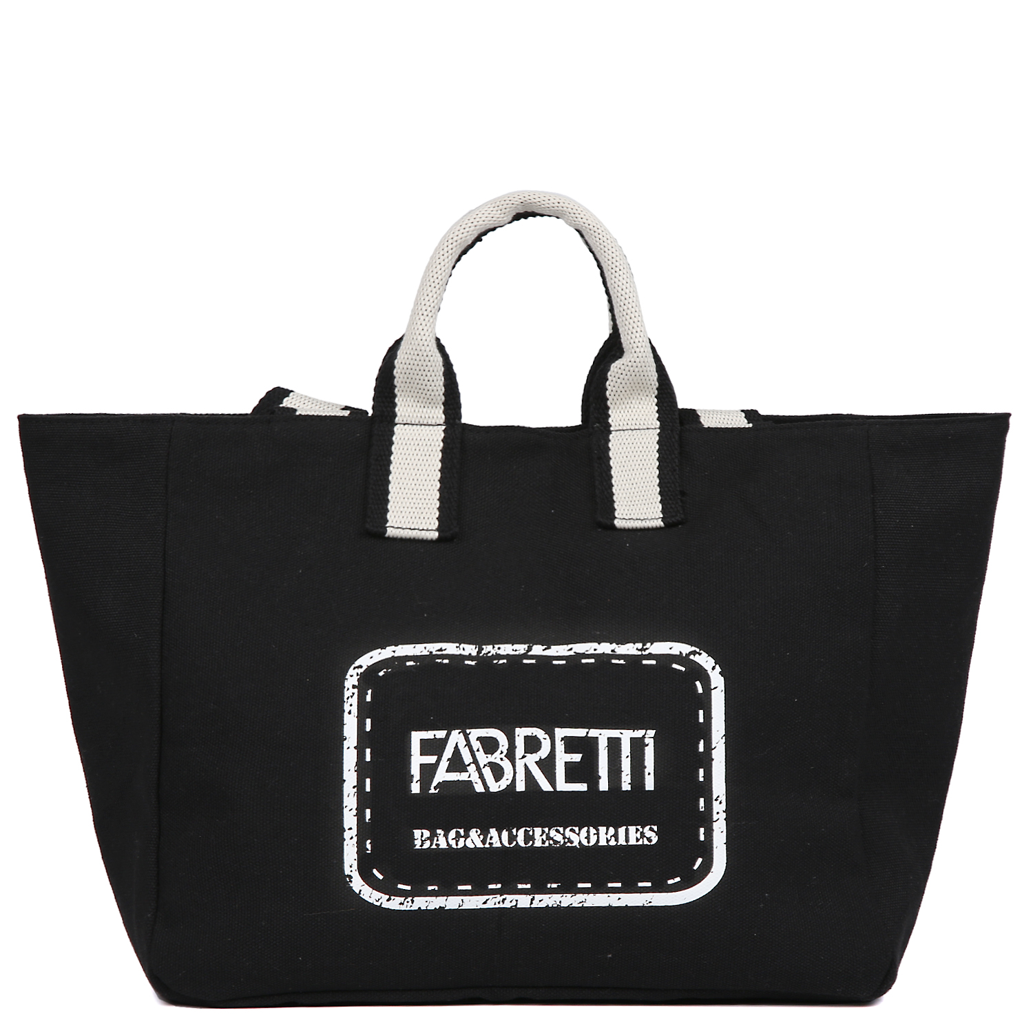 Текстильная сумка FABRETTI в черном оттенке выполнена из хлопковой канвы плотной текстуры и на лицевой стороне декорирована принтом с логотипом бренда. Основное отделение закрывается на магнитную кнопку. Внутри есть 2 открытых боковых кармана для мелочей. Удлиненные текстильные ручки (ширина – 4 см) гармонично дополняют дизайн изделия и позволяют комфортно носить аксессуар на плече. Модель дополнена короткими полукруглыми ручками для ношения аксессуара в руке.
