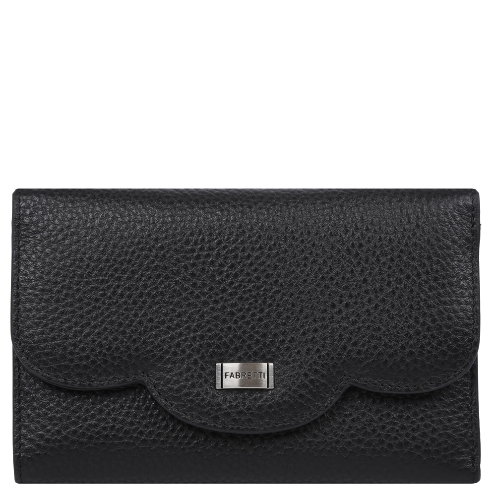 Роскошный женский кошелек от итальянского бренда Fabretti выполнен из натуральной зернистой кожи с мягкой и приятной на ощупь фактурой. Классический черный оттенок и дизайнерская форма накидной части превращают модель в утонченный аксессуар, который подчеркнет ваш изысканный вкус и добавит в образ нотки истинного итальянского шика. Внутри есть удобное отделение для купюр, также вы сможете разместить 12 кредитных или дисконтных карт с помощью специальных отсеков. На тыльной стороне находится небольшой карман для мелких денег. Аксессуар закрывается на заклепку с логотипом бренда.