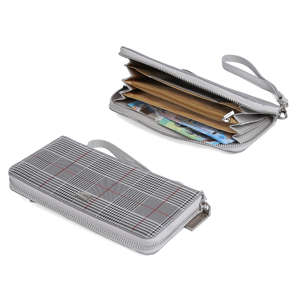 Если вы хотите подчеркнуть свой уникальный вкус присмотритесь к женскому кошельку от итальянского бренда Fabretti. Модель выполнена из натуральной кожи с приятной и мягкой на ощупь фактурой. Роскошное сочетание серебряных оттенков и дизайнерский принт "клетка" создают особый, утонченный дизайн, который понравится всем любительницам итальянской роскоши. Кошелек закрывается на молнию с удобным поводком. К аксессуару прикреплен отстегивающийся кожаный брелок, с помощью которого модель можно легко носить на руке. Внутри находятся 4 вместительных отделения для купюр, а также отдел на молнии, предназначенный для мелочи. Вы с легкостью сможете носить с собой дисконтные и кредитные карты за счет 10 удобных отделений, расположенных внутри аксессуара. На тыльной стороне кошелька имеется компактный кармашек, застегивающийся на аккуратную молнию.