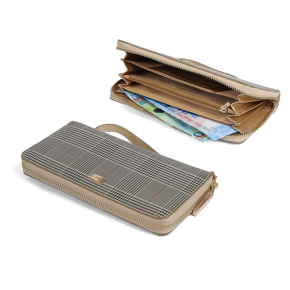 Если вы хотите подчеркнуть свой уникальный вкус присмотритесь к женскому кошельку от итальянского бренда Fabretti. Модель выполнена из натуральной кожи с приятной и мягкой на ощупь фактурой. Роскошное сочетание золотых оттенков и дизайнерский принт "клетка" создают особый, утонченный дизайн, который понравится всем любительницам итальянской роскоши. Кошелек закрывается на молнию с удобным поводком. К аксессуару прикреплен отстегивающийся кожаный брелок, с помощью которого модель можно легко носить на руке. Внутри находятся 4 вместительных отделения для купюр, а также отдел на молнии, предназначенный для мелочи. Вы с легкостью сможете носить с собой дисконтные и кредитные карты за счет 10 удобных отделений, расположенных внутри аксессуара. На тыльной стороне кошелька имеется компактный кармашек, застегивающийся на аккуратную молнию.