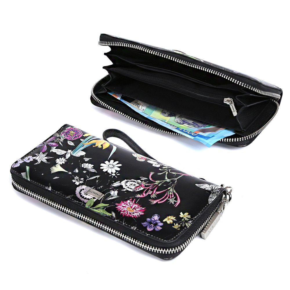 Если вы хотите подчеркнуть свой уникальный вкус присмотритесь к женскому кошельку от итальянского бренда Fabretti. Модель выполнена из натуральной лакированной кожи с приятной и мягкой на ощупь фактурой. Классический черный цвет и дизайнерский принт с изображением цветов создают особый, утонченный дизайн, который понравится всем любительницам итальянской роскоши. Кошелек закрывается на молнию с удобным поводком. К аксессуару прикреплен отстегивающийся кожаный брелок, с помощью которого модель можно легко носить на руке. Внутри находятся 4 вместительных отделения для купюр, а также отдел на молнии, предназначенный для мелочи. Вы с легкостью сможете носить с собой дисконтные и кредитные карты за счет 10 удобных отделений, расположенных внутри аксессуара. На тыльной стороне кошелька имеется компактный кармашек, застегивающийся на аккуратную молнию.