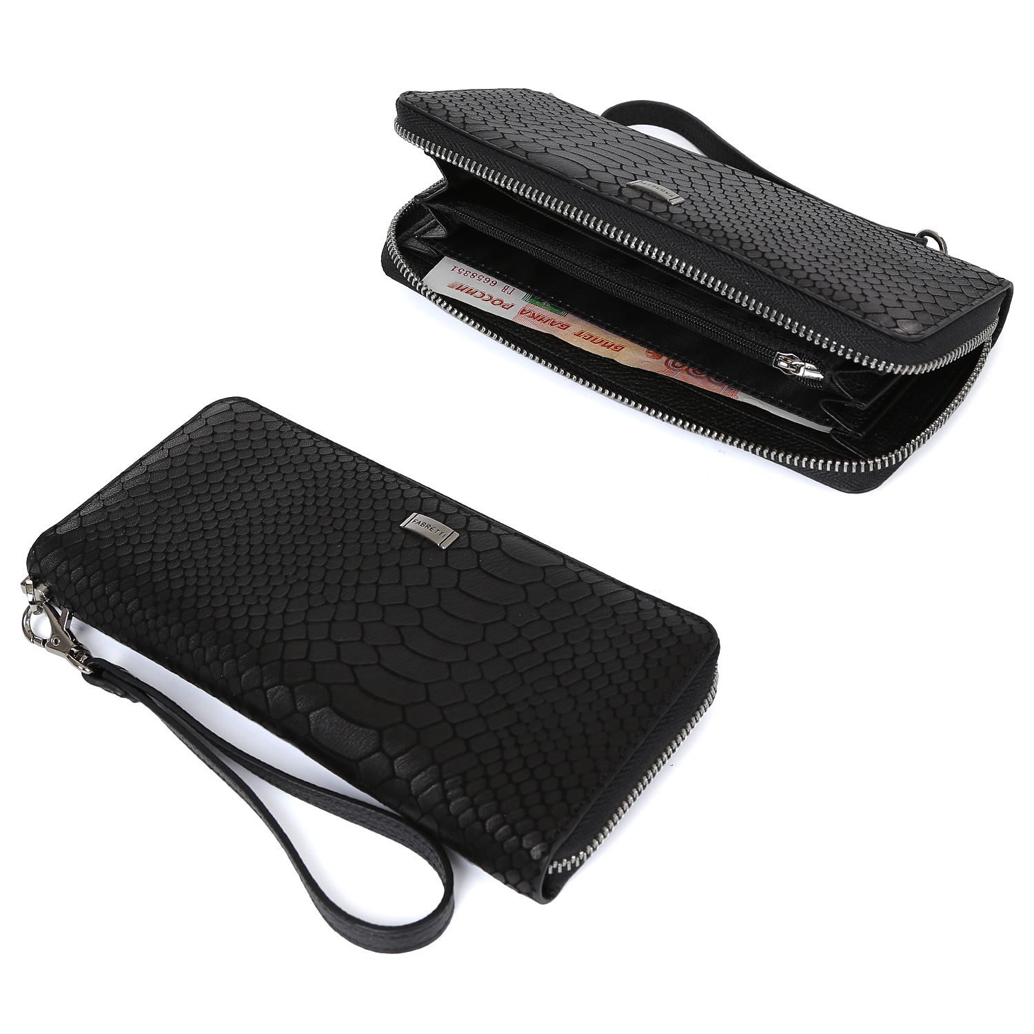 Стильный и вместительный женский кошелек от итальянского бренда Fabretti в классическом черном цвете выполнен из натуральной кожи с тиснением под рептилию. Аксессуар имеет 4 отделения для купюр, 9 карманов для дисконтных и банковских карт, карман для монет на молнии, 2 кармана на боковых стенках и 1 карман на тыльной стороне на молнии. Фурнитура под серебро.