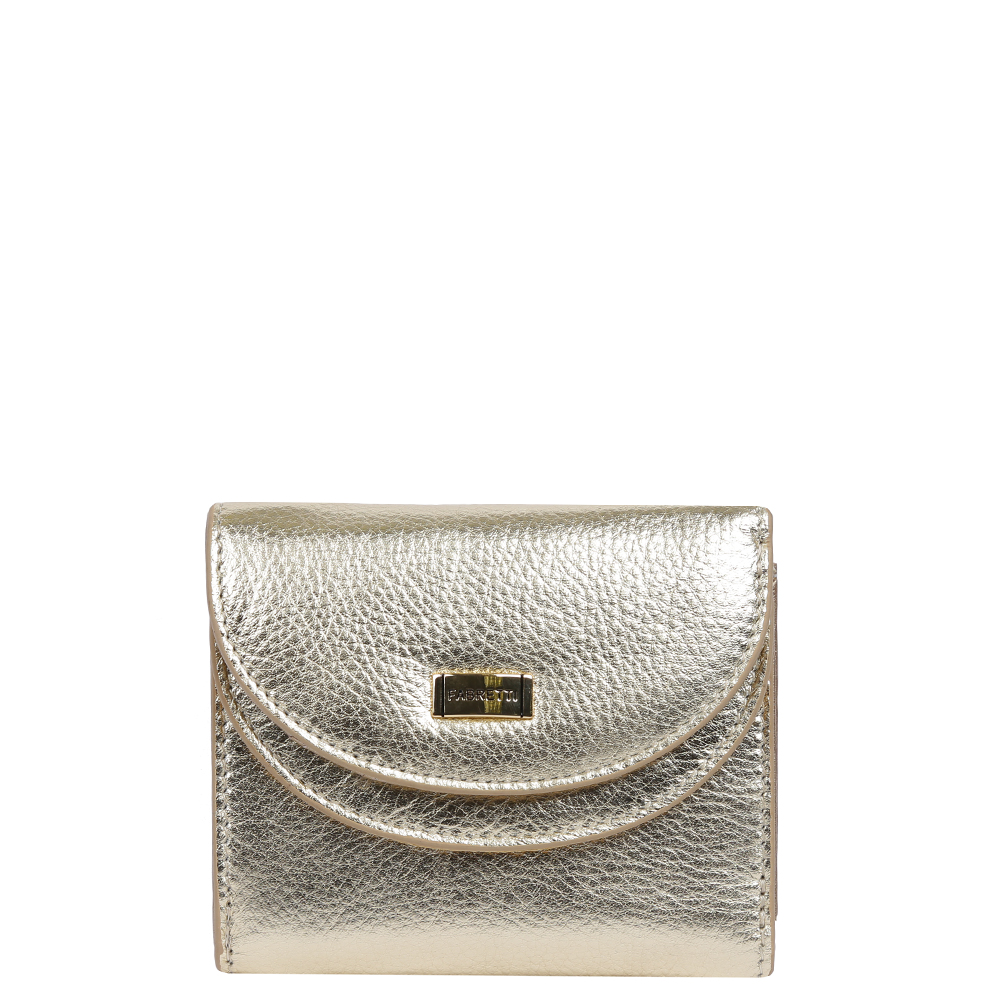 Элегантный женский кошелек от итальянского бренда Fabretti выполнен из натуральной мягкой кожи с металлизированным покрытием. Роскошный золотой оттенок и аккуратная фурнитура, выполненная под цвет модели, превращают кошелек в утонченный и изысканный аксессуар. На лицевой стороне расположен удобный карман для мелочи, который закрывается на застежку, в котором имеется 2 отделения для кредитных карточек. Внутри имеются два вместительных отделения для купюр. Кошелек закрывается на застежку с логотипом бренда.
