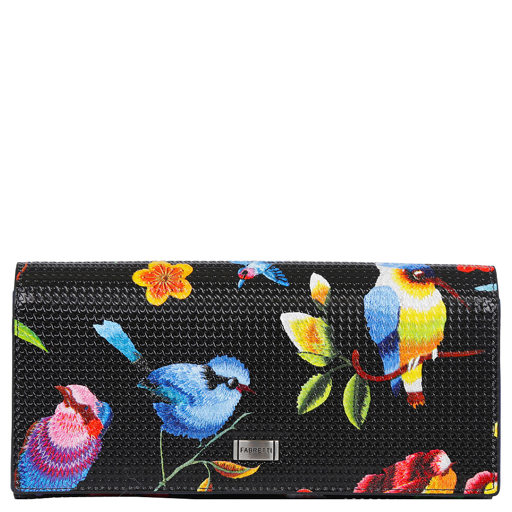 Дизайнерский женский кошелек от итальянского бренда Fabretti выполнен из натуральной ребристой кожи с невероятно мягкой и приятной на ощупь фактурой. Классический черный оттенок в сочетании с эксклюзивным принтом в виде птиц превращают аксессуар в настоящий шедевр, который придется по вкусу любительницам элегантных стилей. Внутри находятся два отделения для купюр, одно из которых закрывается на молнию.Вы сможете разместить все свои дисконтные и кредитные карты с помощью 5 держателей, а также носить с собой любимую фотографию.Изделие закрывается клапаном на кнопке.