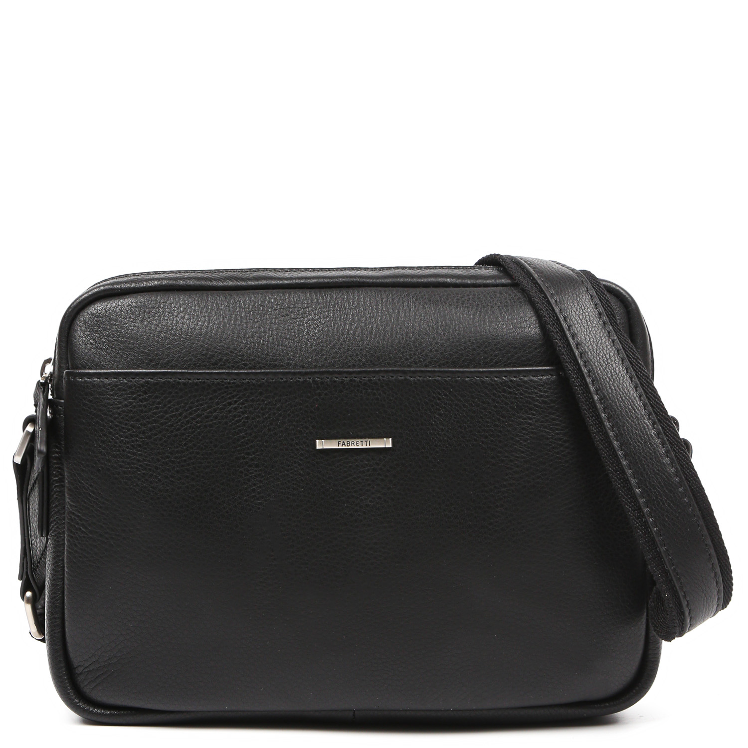 Стильная мужская сумка на плечо FABRETTI выполнена из натуральной зернистой кожи в черном цвете. В сумке 2 отделения, каждое из которых закрывается на полукруглую молнию. Внутри 3 кармана для мелочей: 2 открытых и на молнии. На лицевой стороне есть открытый карман на потайной магнитной кнопке. На тыльной стороне расположен карман быстрого доступа на молнии. Плечевой ремень регулируется по длине, ширина - 3,5 см. Цвет фурнитуры - серебро.
