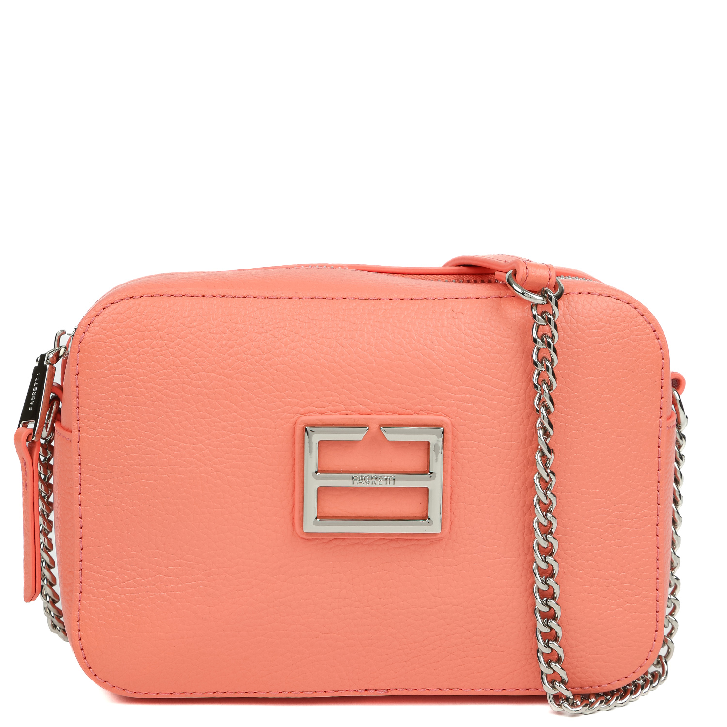 Компактная кросс-боди FABRETTI выполнена из натуральной зернистой кожи в коралловом оттенке. Основное отделение закрывается на полукруглую молнию с кожаным поводком. Внутри 2 боковых кармана: открытый и на молнии. На тыльной стороне предусмотрен карман быстрого доступа на молнии. На лицевой стороне аксессуар декорирован лаконичной монограммой бренда. Изящный плечевой ремень-цепочка позволяет комфортно носить аксессуар через плечо. Цвет фурнитуры - серебро. В сумке поместятся смартфон, паспорт, небольшой кошелек, ключи, разные женские мелочи и даже маленькая книга из серии pocket-books.